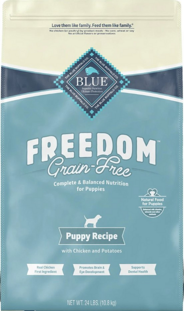 BLUE Freedom® is a delicious, grain free formula that contains no gluten. All BLUE Freedom dog food recipes feature high-quality real meat with no chicken (or poultry) by-product meals. Freedom puppy formula contains ingredients like DHA fatty acid to support your puppy’s healthy growth and development at this important stage in life. BLUE Freedom dog food is a product of the Blue Buffalo company. Based in the United States, Blue Buffalo makes premium-quality pet foods featuring real meat, fruit and vegetables.