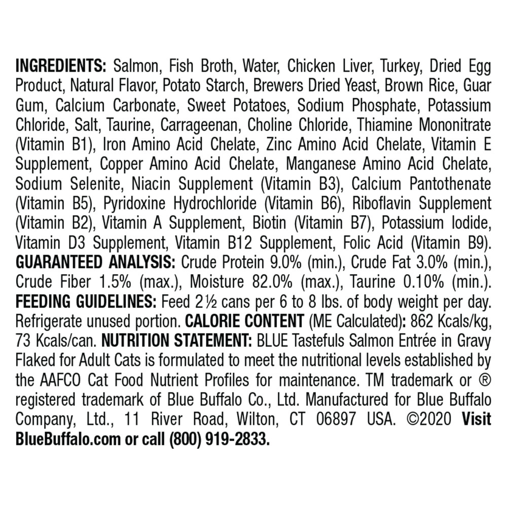BLUE Tastefuls cat food is so delicious, your cat will keep coming back for more. This wet cat food starts with tender flakes of high-quality salmon, plus brown rice and sweet potatoes in savory gravy. Made from the finest natural ingredients enhanced with vitamins, minerals and other nutrients, Tastefuls canned cat food has the great taste cats want with the healthy ingredients you prefer feeding. Let your cat try this mouthwatering flaked entrée to see why one taste is all it takes!