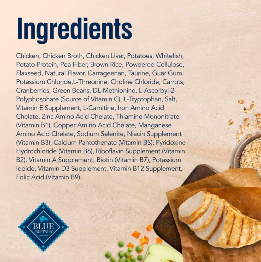 Chicken, Chicken Broth, Chicken Liver, Potatoes, Whitefish, Potato Protein, Pea Fiber, Brown Rice, Powdered Cellulose, Flaxseed, Natural Flavor, Carrageenan, Taurine, Guar Gum, Potassium Chloride, L-Threonine, Choline Chloride, Carrots, Cranberries, Green Beans, DL-Methionine, L-Ascorbyl-2-Polyphosphate (source of Vitamin C), L-Tryptophan, Salt, Vitamin E Supplement, L-Carnitine, Iron Amino Acid Chelate, Zinc Amino Acid Chelate, Thiamine Mononitrate (Vitamin B1), Copper Amino Acid Chelate, Manganese Amino Acid Chelate, Sodium Selenite, Niacin Supplement (Vitamin B3), Calcium Pantothenate (Vitamin B5), Pyridoxine Hydrochloride (Vitamin B6), Riboflavin Supplement (Vitamin B2), Vitamin A Supplement, Biotin (Vitamin B7), Potassium Iodide, Vitamin D3 Supplement, Vitamin B12 Supplement, Folic Acid (Vitamin B9).