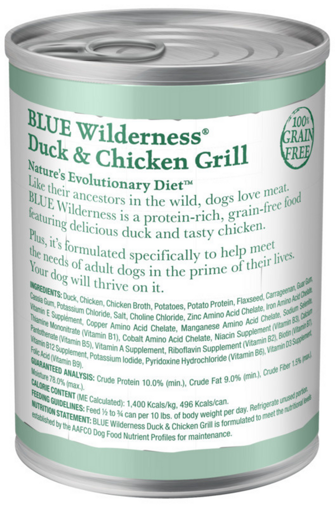 Packed with more of the meat dogs love and free of the grains that contain gluten, BLUE Wilderness wet dog food is made to feed your dog’s wild side. With real duck and chicken, plus fruits and vegetables, this grain free recipe features the finest natural ingredients enhanced with vitamins and minerals. Formulated for the health and well-being of your best friend, this wet dog food provides your adult dog with protein from real duck and chicken to help supply the energy he needs while promoting healthy muscle growth