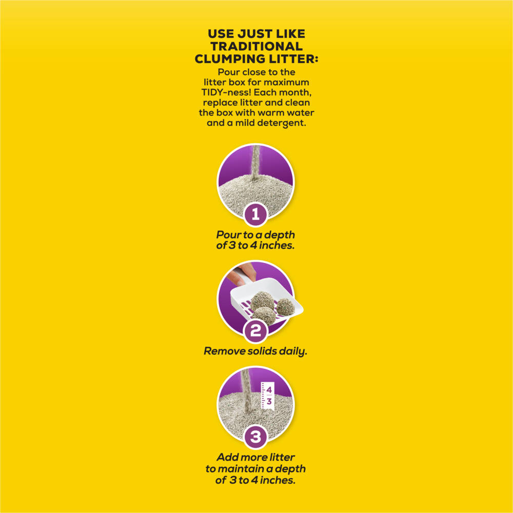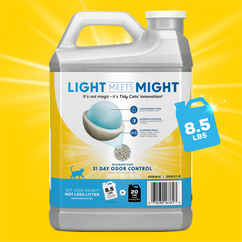 Bring the power of two trusted names in odor control to your home with Purina Tidy Cats LightWeight With Glade Tough Odor Solutions Clear Springs clumping litter. The 100% dust-free formula pours clean into each litter box, keeping messes to a minimum, TidyLock technology in this cat litter odor control solution neutralizes ammonia, urine and fecal odors, keeping each litter box smelling clean and pleasant. A powerful Ammonia Blocker prevents ammonia odor from forming for at least two weeks when used as directed. With Glade Tough Odor Solutions, this clumping cat litter defends against strong scents, leaving behind a fresh fragrance. At half the weight of leading clumping litter, this litter solution forms strong, tight clumps, making litter box maintenance a simple task. Formulated for multiple cats, this litter stands up to regular use by all your feline family members, and the moisture-locking technology keeps them dry and comfortable. Check litter box cleaning off of your list with this powerful odor-control clumping cat litter, and get back to spending more quality time with your beloved cat companions.Tend to your cats' personal needs while keeping your home smelling fresh with Purina Tidy Cats LightWeight With Glade Tough Odor Solutions Clear Springs clumping litter. The 100% dust-free formula pours clean into each litter box, keeping messes to a minimum, and the odor-neutralizing action defends against overpowering smells. With a light, pleasant Clear Springs fragrance, this clumping litter adds a delightful scent to your home and makes each cat's box a welcoming place. The added Ammonia Blocker prevents ammonia odor from forming for at least two weeks when used as directed. Packaged in a convenient single-handle jug, this litter is half the weight of leading clumping litter, making it easy to pour, store and carry. Stock up on this Tidy Cats litter so you have an ample supply for whenever your cats' litter boxes need to be freshened up. Formulated for multiple cats, this litter takes the hassle out of cat box maintenance. We recommend scooping solid waste every day and cleaning each box with warm water and a mild detergent in between litter changes to keep each box tidy and ready to use. When switching to this odor-fighting litter, gradually introduce it to each cat's box so they can become used to the pleasant scent and new texture. Pour 3 to 4 inches of litter in each box so your cats can dig around to their individual comfort level, and add new litter to the boxes as needed. For more ways to fight odor and keep your cats' corner neat and clean, explore our other litter box solutions. Tidy Cats litter box liners contain litter for easy box changes, and Tidy Cats litter deodorizer brings a crisp, clean scent to your home to fight tough odors. With so many different options to choose from, there's sure to be a Tidy to meet your cats' needs.