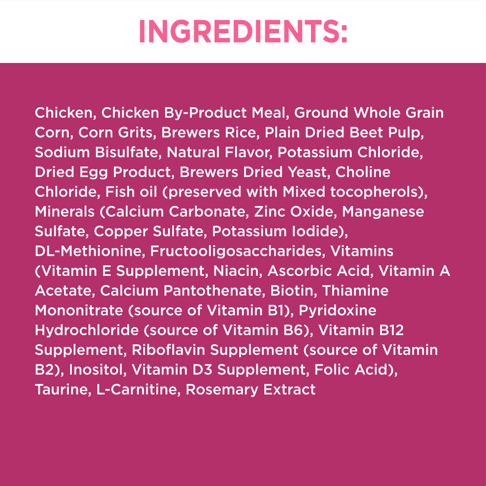 Chicken, Chicken By-Product Meal, Ground Whole Grain Corn, Corn Grits, Brewers Rice, Plain Dried Beet Pulp, Sodium Bisulfate, Natural Flavor, Potassium Chloride, Dried Egg Product, Brewers Dried Yeast, Choline Chloride, Fish oil (preserved with Mixed tocopherols), Minerals (Calcium Carbonate, Zinc Oxide, Manganese Sulfate, Copper Sulfate, Potassium Iodide), DL-Methionine, Fructooligosaccharides, Vitamins (Vitamin E Supplement, Niacin, Ascorbic Acid, Vitamin A Acetate, Calcium Pantothenate, Biotin, Thiamine Mononitrate (source of Vitamin B1), Pyridoxine Hydrochloride (source of Vitamin B6), Vitamin B12 Supplement, Riboflavin Supplement (source of Vitamin B2), Inositol, Vitamin D3 Supplement, Folic Acid), Taurine, L-Carnitine, Rosemary Extract