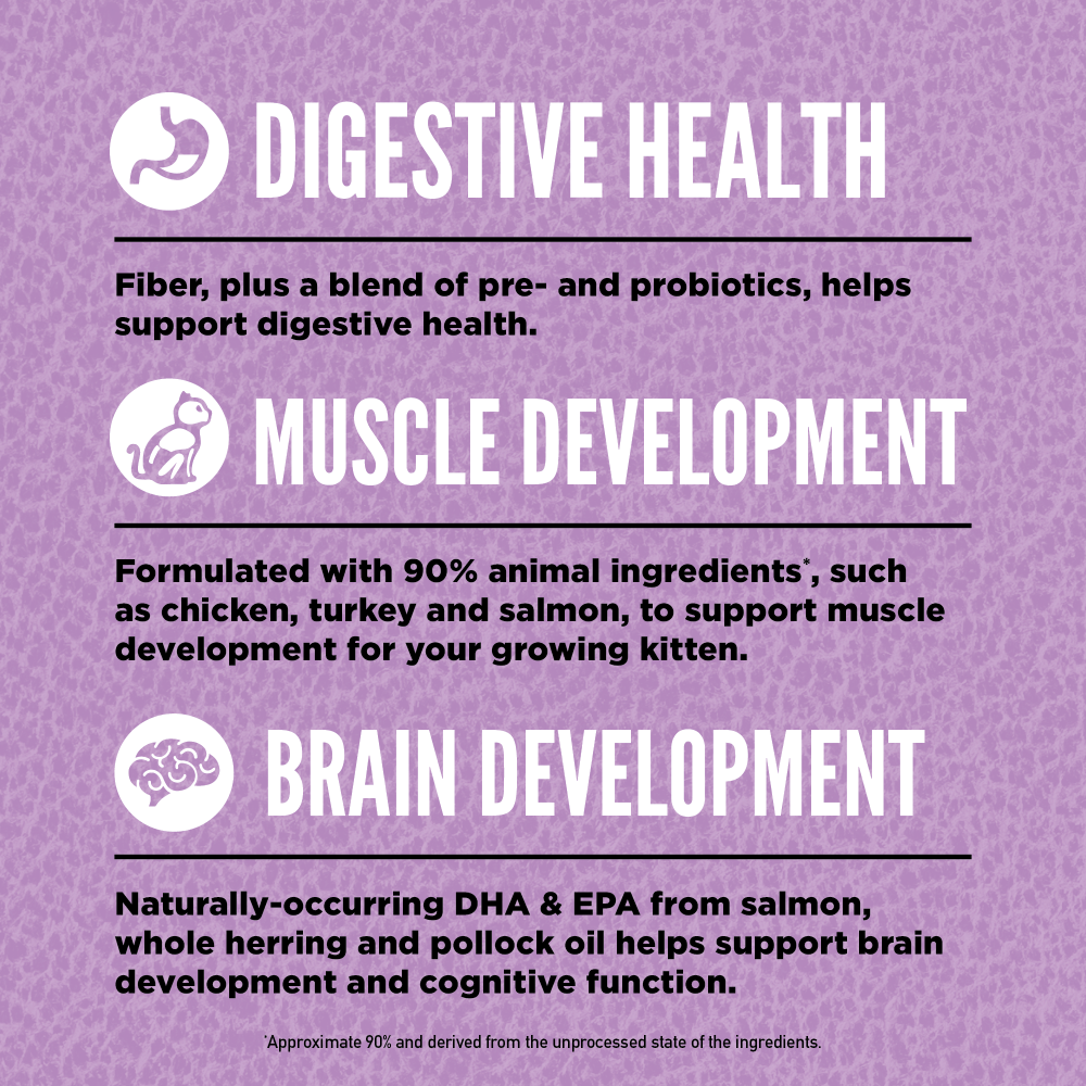 • Packed with 90 percent animal ingredients*, this high protein cat food contains the most succulent and nourishing parts of the prey to help your growing kitten thrive