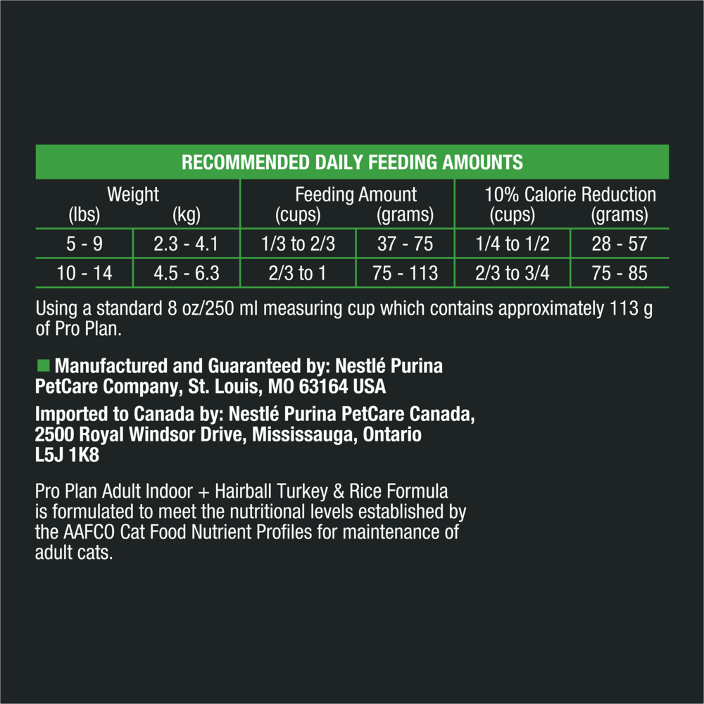 Pay extra attention to your indoor cat's special nutritional needs and help control hairballs when you feed her Purina Pro Plan Indoor Hairball Turkey and Rice Formula adult dry cat food. This formula features high-protein nutrition to help her maintain a healthy weight, and it contains high-quality protein sources, including real turkey as the first ingredient. Natural prebiotic fiber nourishes specific intestinal bacteria for digestive health. Every ingredient in this dry cat food is carefully chosen for a specific purpose, so you can feel confident about the food you put in your cat's dish every day. This dry cat food delivers essential nutrients, including antioxidants to help support her healthy immune system, and it provides 100 percent complete and balanced nutrition for adult cats. Nurture your cat's natural greatness when you make this formula part of her daily diet.