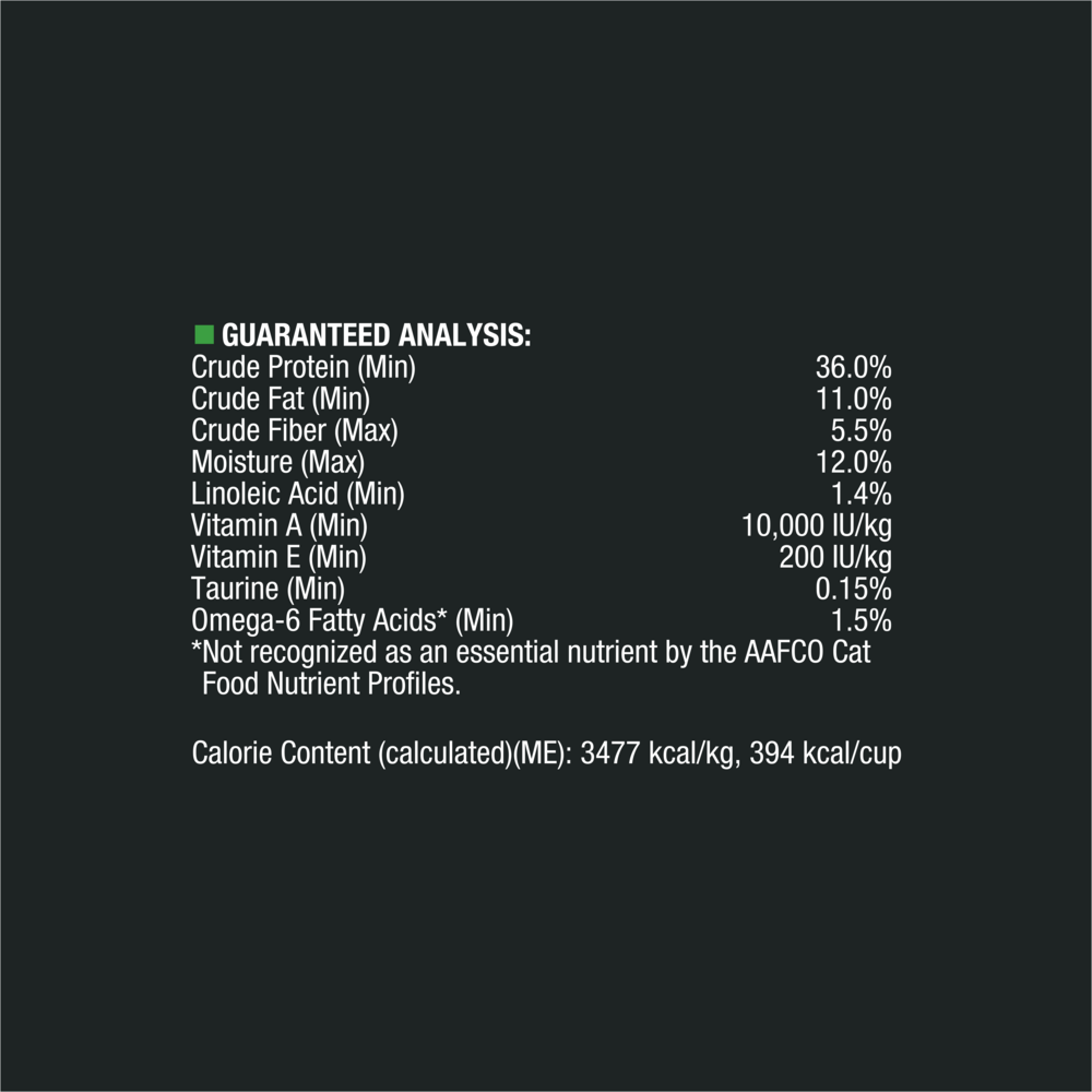 Turkey, Corn Gluten Meal, Chicken Meal, Rice, Powdered Cellulose, Soybean Meal, Beef Fat Preserved With Mixed-tocopherols, Soy Protein Isolate, Dried Egg Product, Soy Protein Concentrate, Cassava Root Flour, Natural Flavor, Sodium Caseinate, Glycerin, Chicken, Chicory Root Inulin, Salt, Potassium Chloride, Calcium Carbonate, Gelatin, Phosphoric Acid, Caramel color, Choline Chloride, Taurine, Minerals [Zinc Sulfate, Ferrous Sulfate, Manganese Sulfate, Copper Sulfate, Calcium Iodate, Sodium Selenite], Vitamins [Vitamin E Supplement, Niacin (Vitamin B-3), Vitamin A Supplement, Calcium Pantothenate (Vitamin B-5), Thiamine Mononitrate (Vitamin B-1), Riboflavin Supplement (Vitamin B-2), Vitamin B-12 Supplement, Pyridoxine Hydrochloride (Vitamin B-6), Folic Acid (Vitamin B-9), Vitamin D-3 Supplement, Biotin (Vitamin B-7), Menadione Sodium Bisulfite Complex (Vitamin K)], L-lysine Monohydrochloride, L-cysteine, Sodium Bisulfate, Dl-methionine, Dried Bacillus Coagulans Fermentation Product, Sulfur. B461119Crude Protein (Min)...36.0%, Crude Fat (Min)...10.0%, Crude Fat (Max)...14.4%, Crude Fiber (Max)...7.0%, Moisture (Max)...12.0%, Linoleic Acid (Min)...1.4%, Vitamin A (Min)...10,000 IU/kg, Vitamin E (Min)...200 IU/kg, Taurine (Min)...0.15%, Omega-6 Fatty Acids* (Min)...1.5%, Bacillus coagulans* (Min)...600 million CFU/lb *Not recognized as an essential nutrient by the AAFCO Cat Food Nutrient Profiles.