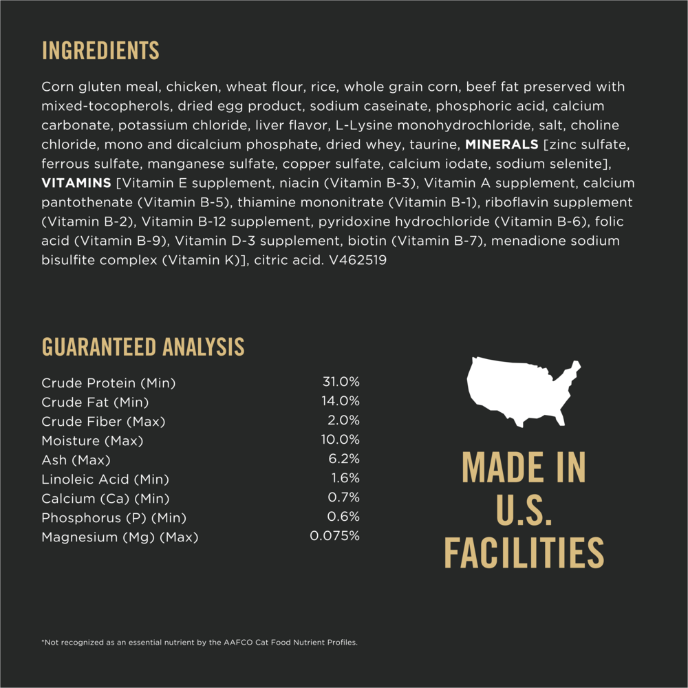 Corn Gluten Meal, Chicken, Wheat Flour, Brewers Rice, Ground Yellow Corn, Animal Fat Preserved With Mixed-Tocopherols, Egg Product, Sodium Caseinate, Phosphoric Acid, Calcium Carbonate, Potassium Chloride, Animal Digest, Salt, L-Lysine Monohydrochloride, Dried Whey, Choline Chloride, Dicalcium Phosphate, Taurine, Zinc Sulfate, Ferrous Sulfate, Manganese Sulfate, Vitamin E Supplement, Niacin, Citric Acid, Vitamin A Supplement, Calcium Pantothenate, Thiamine Mononitrate, Copper Sulfate, Riboflavin Supplement, Vitamin B-12 Supplement, Pyridoxine Hydrochloride, Folic Acid, Vitamin D-3 Supplement, Calcium Iodate, Biotin, Menadione Sodium Bisulfite Complex (Source Of Vitamin K Activity), Sodium Selenite.