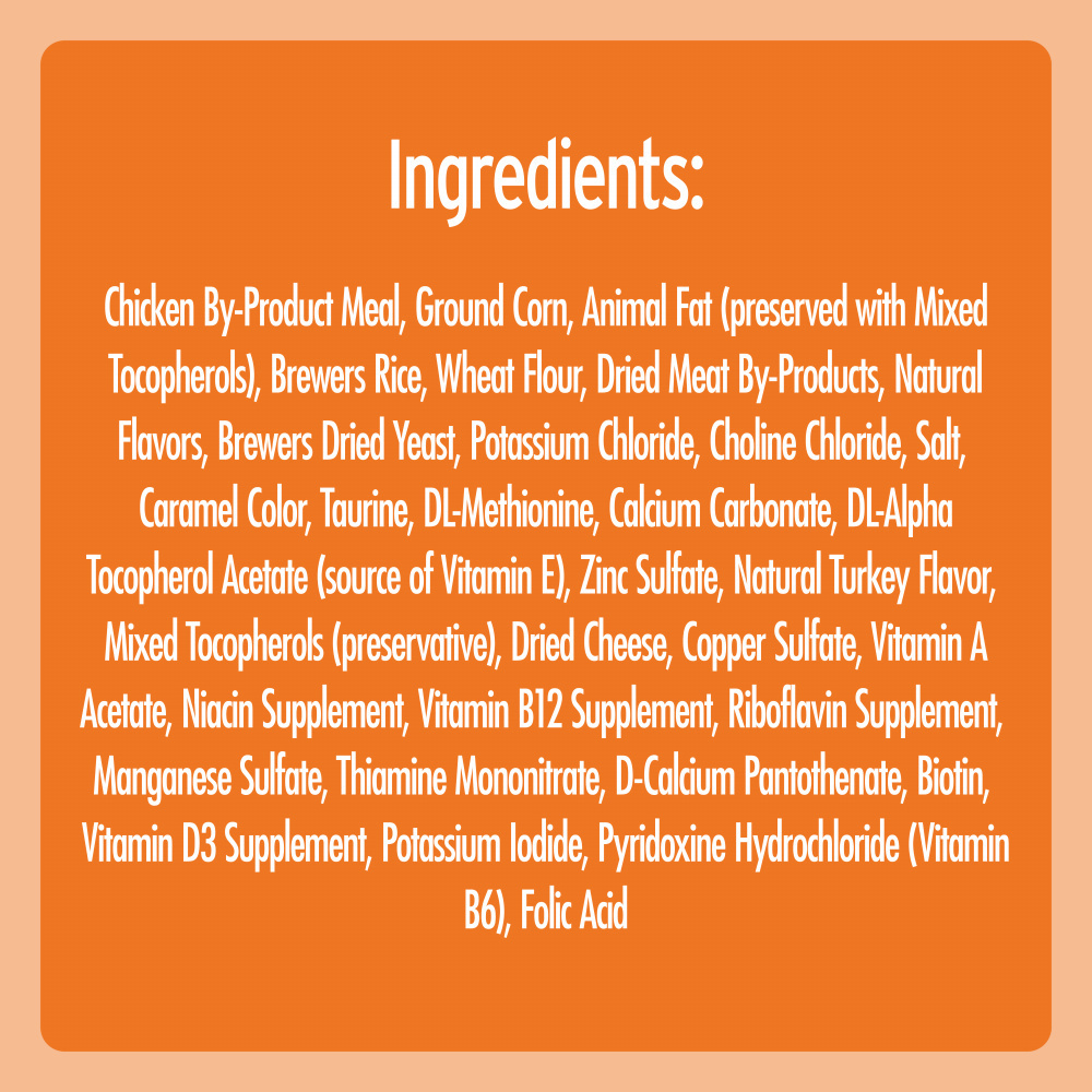 Chicken By-Product Meal, Ground Corn, Animal Fat (preserved with Mixed Tocopherols), Brewers Rice, Wheat Flour, Dried Meat By-Products, Natural Flavors, Brewers Dried Yeast, Potassium Chloride, Choline Chloride, Salt, Caramel Color, Taurine, DL-Methionine, Calcium Carbonate, DL-Alpha Tocopherol Acetate (source of Vitamin E), Zinc Sulfate, Natural Turkey Flavor, Mixed Tocopherols (preservative), Dried Cheese, Copper Sulfate, Vitamin A Acetate, Niacin Supplement, Vitamin B12 Supplement, Riboflavin Supplement, Manganese Sulfate, Thiamine Mononitrate, D-Calcium Pantothenate, Biotin, Vitamin D3 Supplement, Potassium Iodide, Pyridoxine Hydrochloride (Vitamin B6), Folic Acid