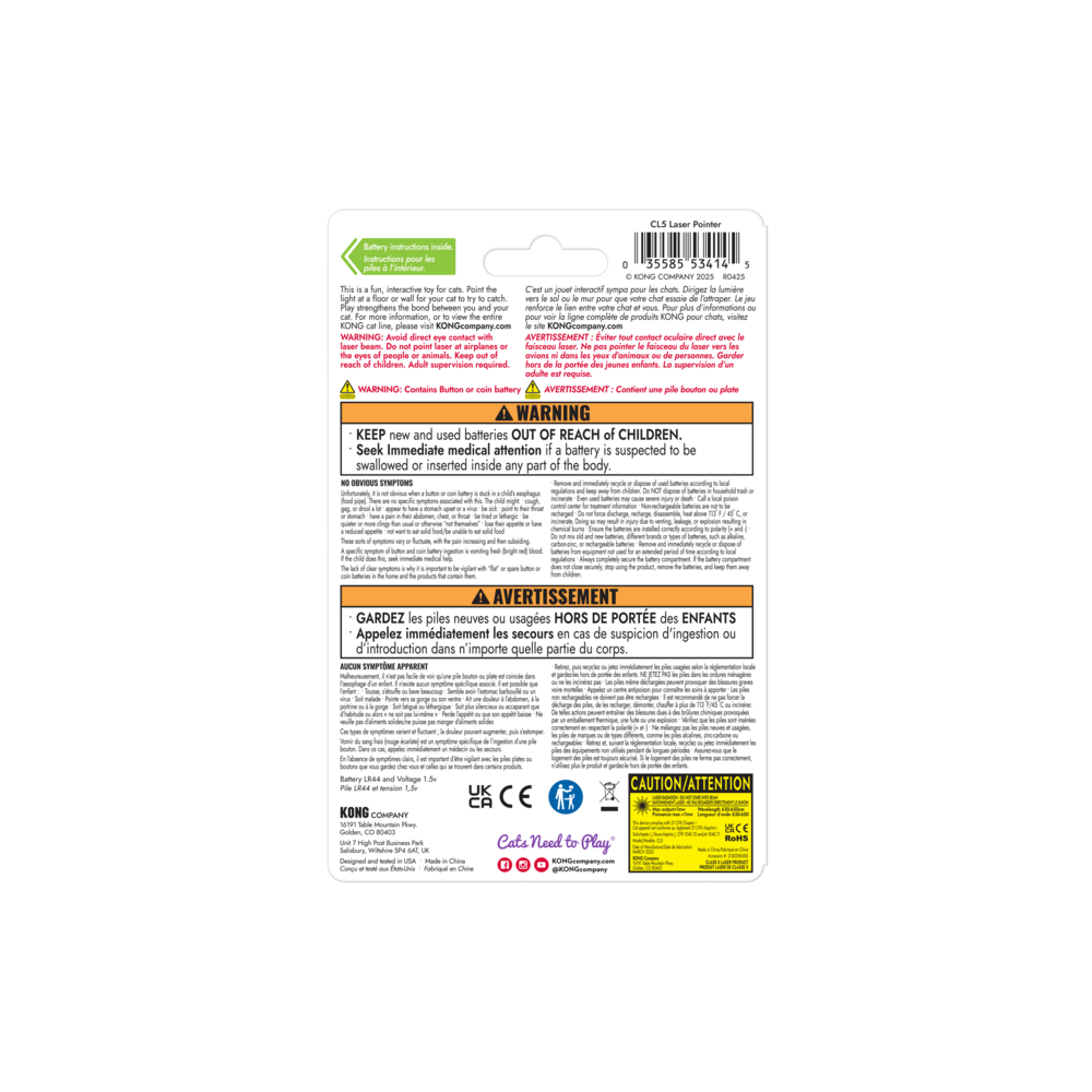The KONG Laser helps facilitate interactive play sessions and provides endless fun. Point the laser at the floor or wall and let your cat chase and attempt to capture its elusive prey.