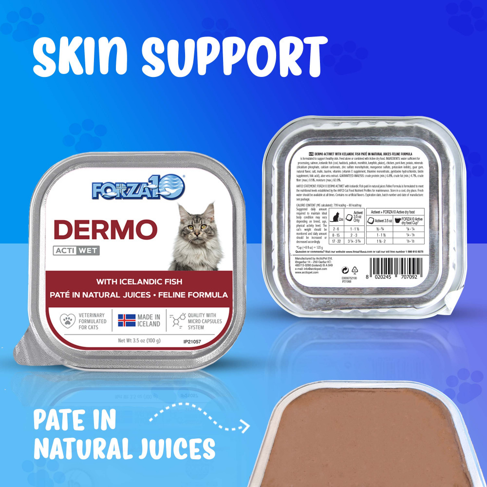 Say goodbye to coat and skin problems with Forza10 Nutraceutic ActiWet Dermo Support Icelandic Fish Recipe Canned Cat Food. This specially formulated diet gives cats complete and balanced nutrition while eliminating common allergens that can cause skin trouble. It's made with simple, clean ingredients like 100% Icelandic fish and potatoes, with turmeric, papaya, and pomegranate added in for their therapeutic plant compounds. A great choice for kitties who suffer from itchy skin, fur loss, hot spots, and other uncomfortable skin issues.