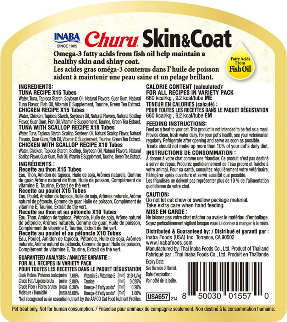Inaba Cat Churu Skin & Coat 50 TubesWhy We Love It Taste your cat will love Creates an interation between the pet and pet parent All natural ingrediants IngredientsTuna Recipe x15 Tubes Water,...