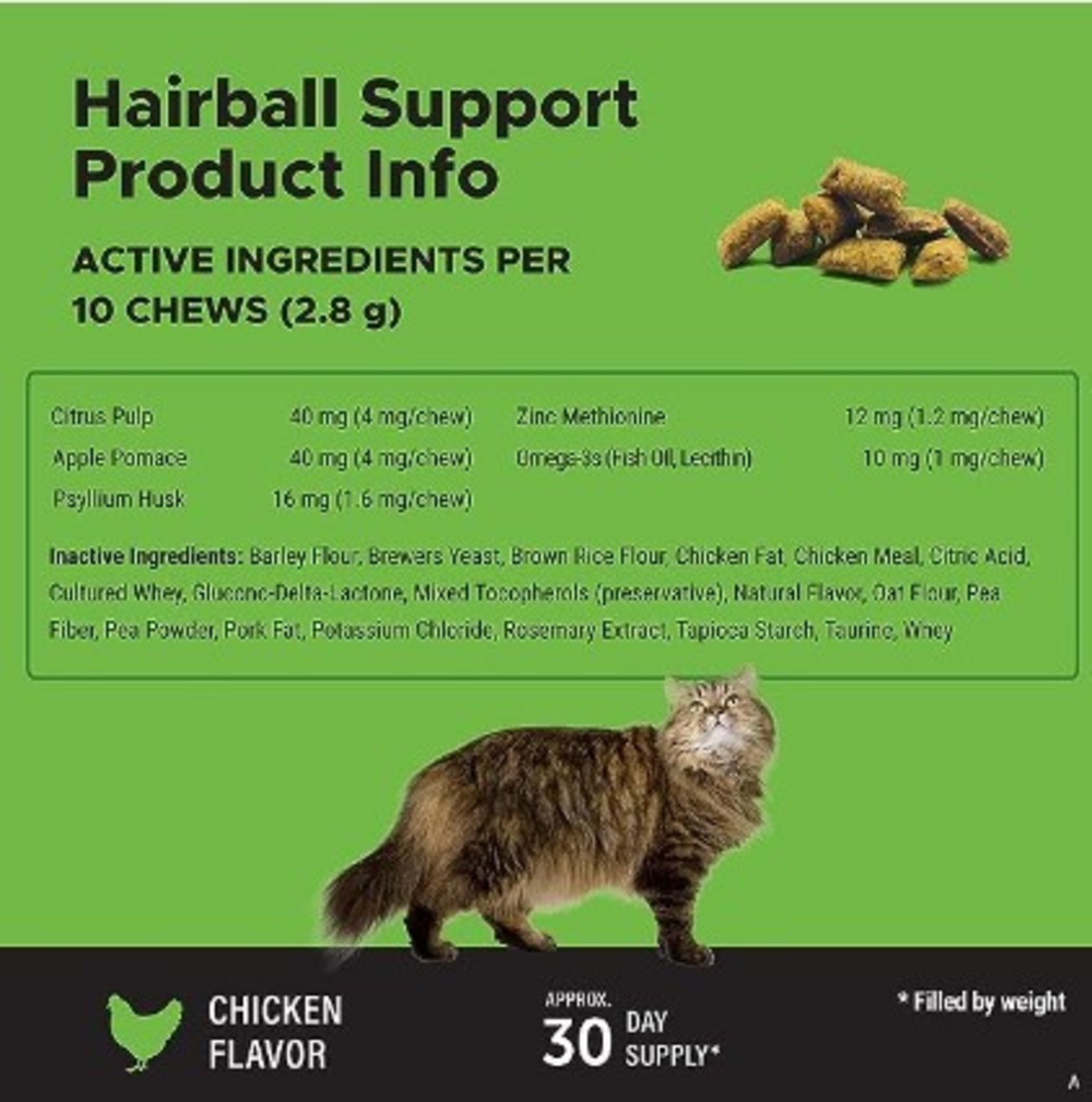 Pet Honestys Hairball Support is a delicious dual textured supplement that helps promote the removal of hairballs and support skin health Powerful ingredients like Apple Pomace Zinc and Psyllium Husk support digestion and skin health to promote hairball removal while helping prevent future ones from forming The unique texture format pairs a crunchy outer shell with a creamy savory filling offering a taste and texture combination that cats love Give 1 chew per 1LB of body weight For kittens under 6 months give half a dose