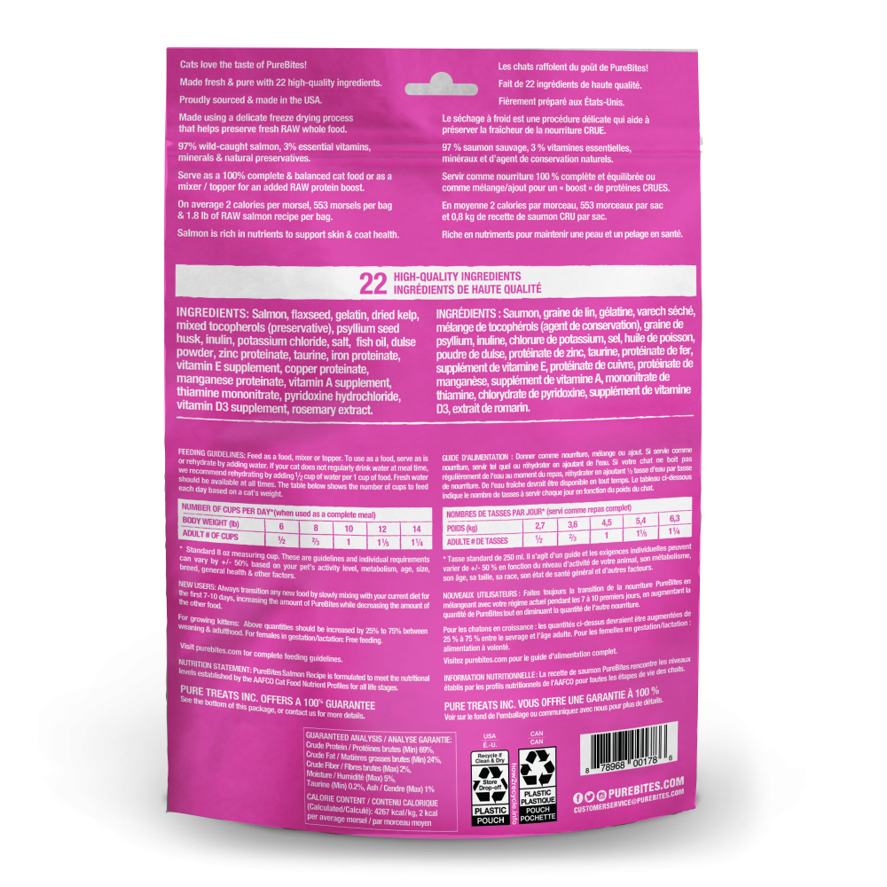 At PureBites, we?re always asking pet parents to ?Go ahead, look at our ingredients?. Simplicity and the high-quality ingredients we choose to feed our family makes a difference. At PureBites this means every member of our family. PureBites RAW freeze dried salmon recipe is the ultimate single protein source, limited ingredient cat food, mixer, or topper. Made with only 22 simple human grade ingredients you can read, pronounce, and trust: 97% pure wild-caught salmon and 3% essential vitamins, minerals, & natural preservatives. Nothing else. No artificial colors, fillers, or sweeteners. Proudly sourced and made in the USA using a delicate freeze drying process that helps preserve fresh RAW whole food, locking in the taste cats crave and the high protein / low calorie nutrition that pet parents love. PureBites freeze dried salmon recipe can be fed as a complete & balanced cat food or as a compliment to a RAW diet since it retains many of the benefits of RAW without the hassle of refrigeration.