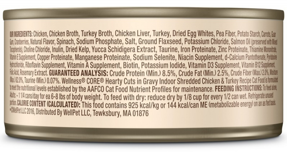 Wellness CORE Grain Free Hearty Cuts Indoor Chicken and Turkey Canned Cat Food is a great way to get on your cat’s good side! This recipe makes your cat’s meals meatier with all the delicious cuts of chicken and turkey covered in both a chicken and turkey mixed broth making this food packed with flavor. Not only is this recipe grain-free and will help aid in digestion, but this recipe has Superfoods like carrots and spinach to help keep your cat overall healthy and active!