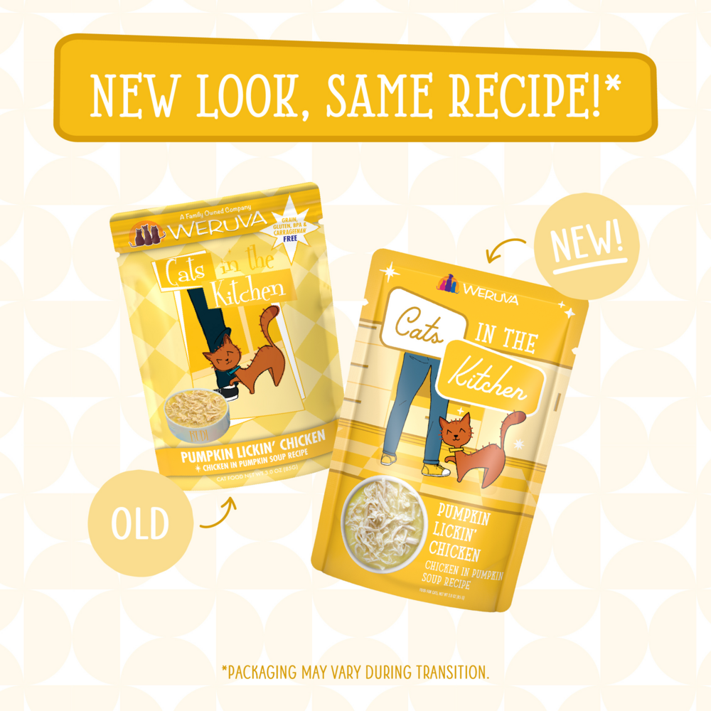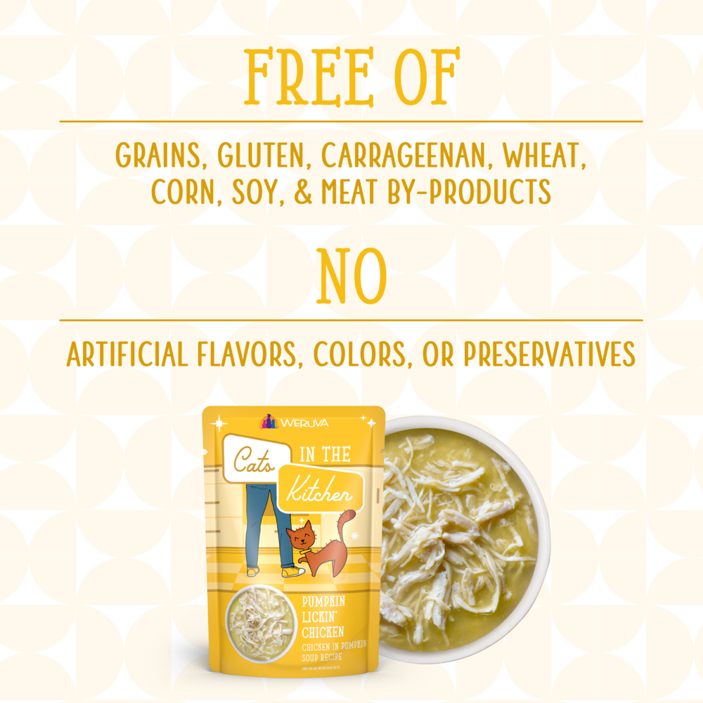 Why are there so many cats in the kitchen you ask? Probably because you're feeding your cats Weruva Cats In the Kitchen Pumpkin Lickin Chicken Pouches Wet Cat Food and they simply cannot get enough. Full of pumpkin and white breast, skinless, and boneless chicken, this wholesome food is full of protein and free of any grains, GMOs, MSG, and carrageenan for a balanced meal in each can. Pumpkin is also proven to help with any digestive issues, making Weruva Cats In the Kitchen Pumpkin Lickin Chicken Pouches Wet Cat Food a perfect food for any kitties with tummy issues.