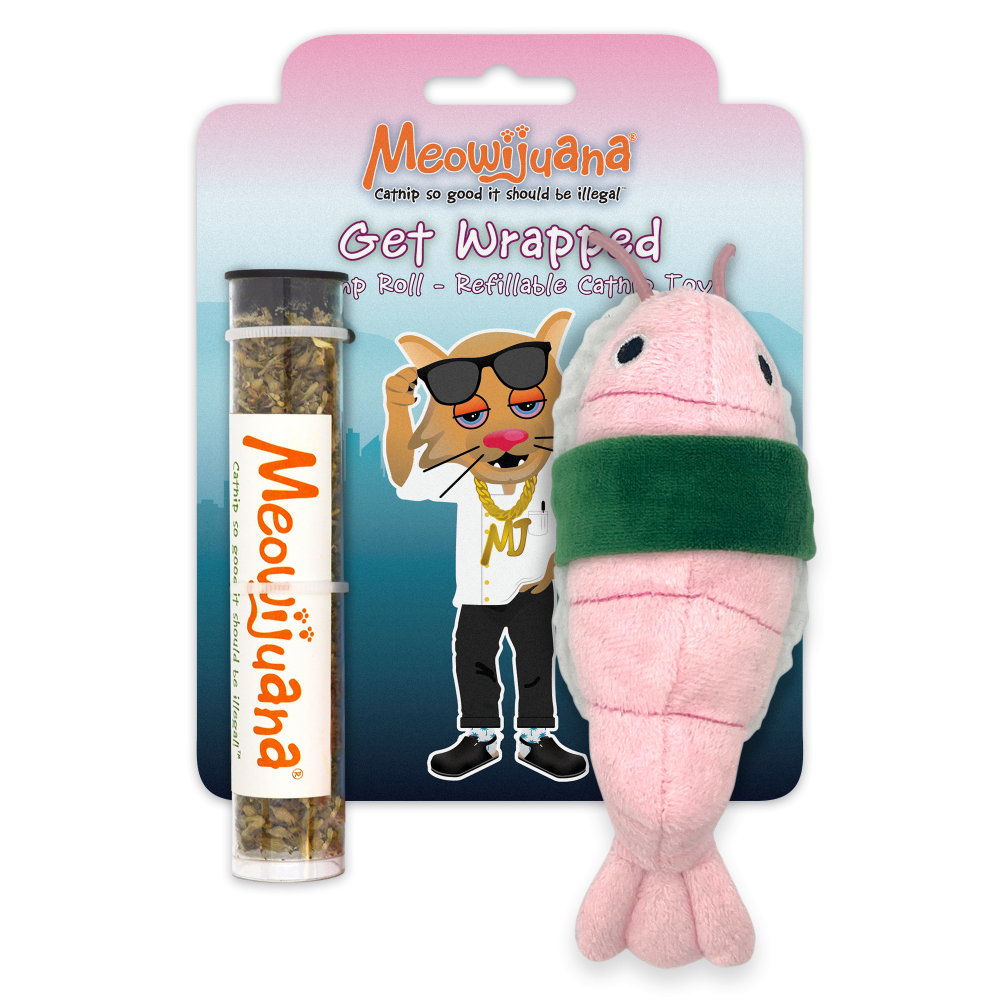 Now your cat won't have to steal your sushi! Cats love sushi more than we do. Stuff some of our homegrown dope 'nip into the large pocket on our durable, refillable Get Wrapped Sushi Roll toy and your cat can roll around with a piece of their own instead of taking one of yours. Your kitties will MEOW for more.