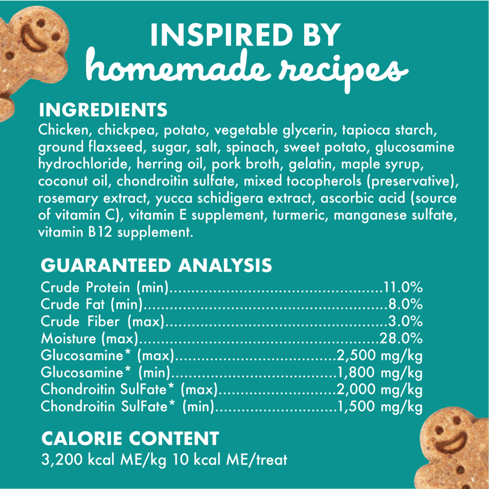 Chicken, chickpea flour, vegetable glycerin, potato flour, tapioca starch, ground flaxseed, sugar, glucosamine hydrochloride, spinach, sweet potato, herring oil, maple syrup, phosphoric acid, salt, xanthan gum, sorbic acid (preservative), chondroitin sulfate, yucca schidigera extract, ascorbic acid (source of vitamin C), vitamin E supplement, turmeric, manganese sulfate, vitamin B12 supplement, mixed tocopherols (preservative), rosemary extract.