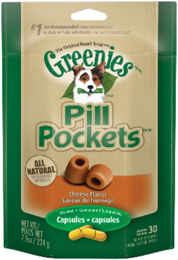 Pill pockets turn pill time into treat time! GREENIES Pill Pockets Treats for Dogs make it easy to give your dog medicine, with a tasty chicken flavor they’re sure to love. Why hide your pet’s medicine in human foods like peanut butter or cheese when you can give them a healthy dog treat, made with natural ingredients plus trace nutrients instead? Designed by veterinarians, GREENIES Pill Pockets Dog Treats mask the smell and taste of any medicine, taking the stress (and mess) out of giving your canine companion medicine. Whether for large breed or small dogs, these smaller-sized Pill Pockets for tablets make taking medicine a positive experience for your dog. And they’re easy to give: Simply drop a tablet into the Pill Pockets pouch, pinch the top half closed, give it to your pup, and poof: Watch their medicine disappear. GREENIES Pill Pockets are the ingenious way to give your dog their meds—and they’ll never know the difference. * Data on file at Mars Petcare US, Inc. 2018