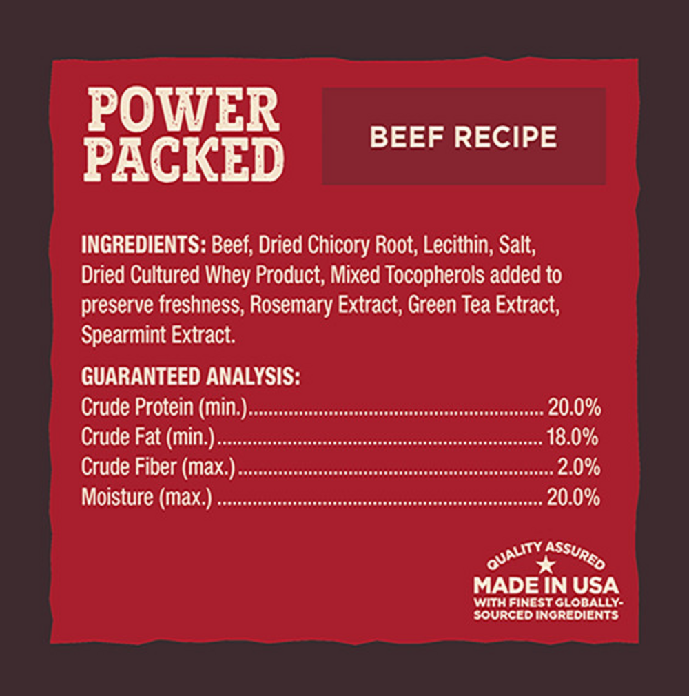 Beef, Turkey, Chickpeas, Ground Potatoes, Vegetable Glycerin, Guar Gum, Carrots, Cane Molasses, Salt, Natural Smoke Flavor, Blueberries, Garlic Powder, Flaxseed, Phosphoric Acid, Sweet Potatoes, Apples, Sorbic Acid (a preservative), Mixed Tocopherols added to preserve freshness, Rosemary Extract, Green Tea Extract, Spearmint Extract.