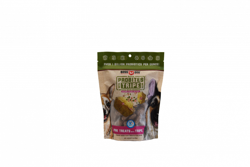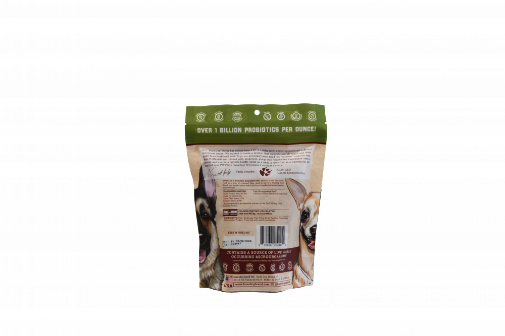 Our ?Boss Dog? Kelby has always been a bit of a picky eater, and struggled to get sufficient nutritional intake. We wanted to create a product that supports overall health and tastes great! Boss ProBites® with Tripe are delicious freeze dried raw ?bitesize? treats for dogs. Boss ProBites® are infused with probiotics, along with wholesome ingredients used to promote and maintain optimal health. Great as a treat, a reward or as a training tool. We hope that your VIP (Very Important Pet) enjoys it as much as ours.