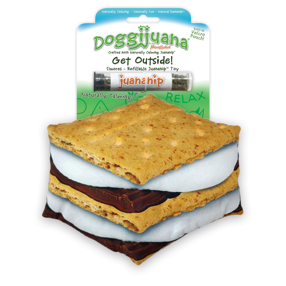 Juananip has a calming effect on dogs. It relaxes them to a place of peace and tranquility they all crave. Doggijuana perfected a really great delivery system for our Juananip with our refillable, fun toys made for pawtiers. Enjoy some right now with our Refillable Get Outdoors Smores Toy. Stuff a pinch into the pouch for a healthy hand tossed play session that will curb natural play instincts easing your dog into doggi-vana. Play Longer.
