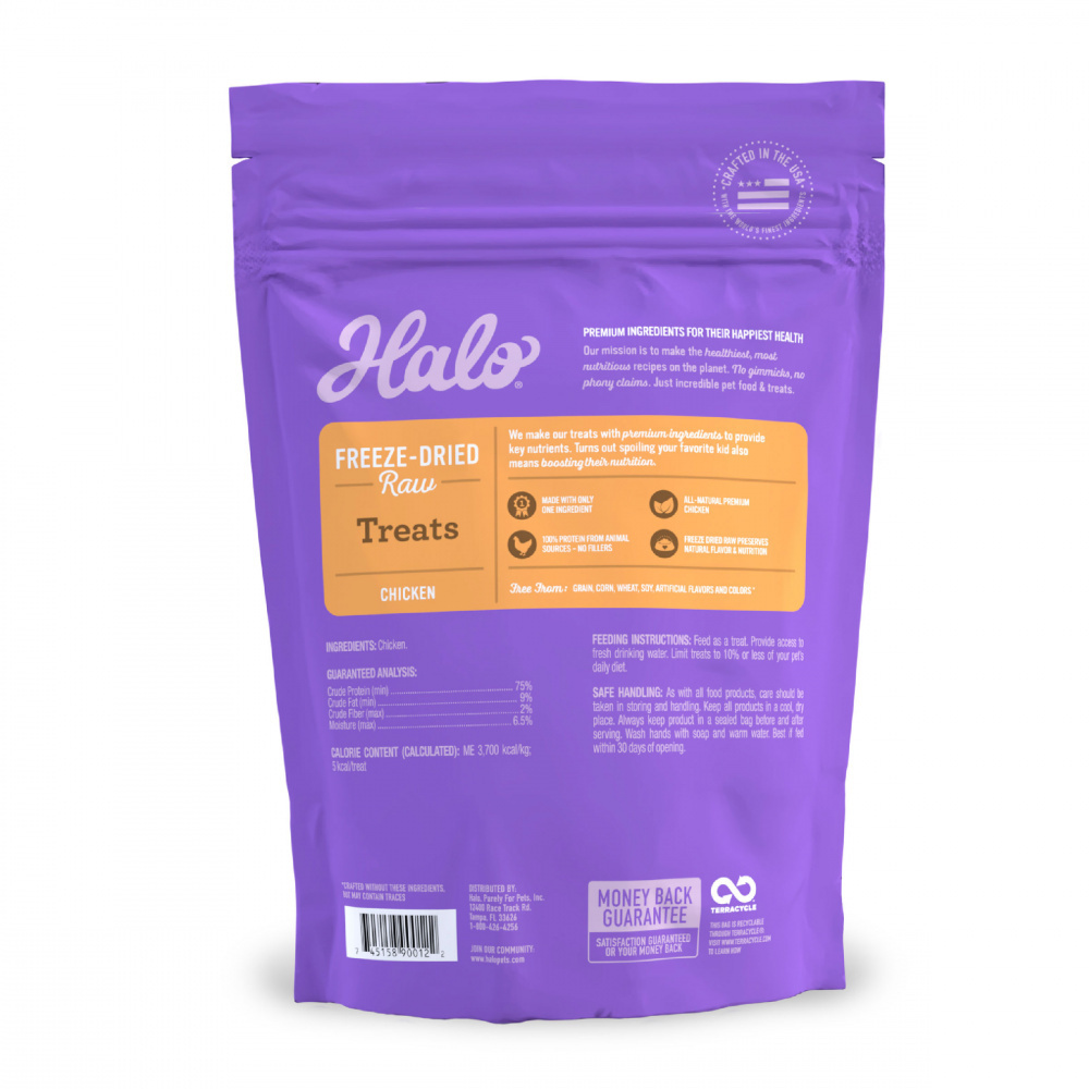 Bring home a 3.7-oz pouch of Halo Freeze Dried Dog Treats, made with 100 percent all-natural, premium, freeze dried raw chicken for delicious flavor.