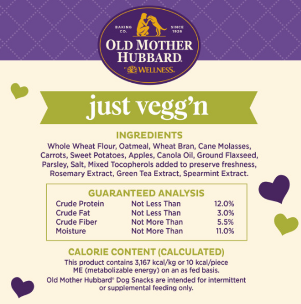 Old Mother Hubbard Special Recipe Just Vegg'n Low Fat biscuits are not only low in fat but low in sodium too. Made with natural ingredients like oatmeal, real parsley and real flaxseed. For added nutritional benefits, we blend in apples and fresh ground carrots. Perfect for any dog, any time.