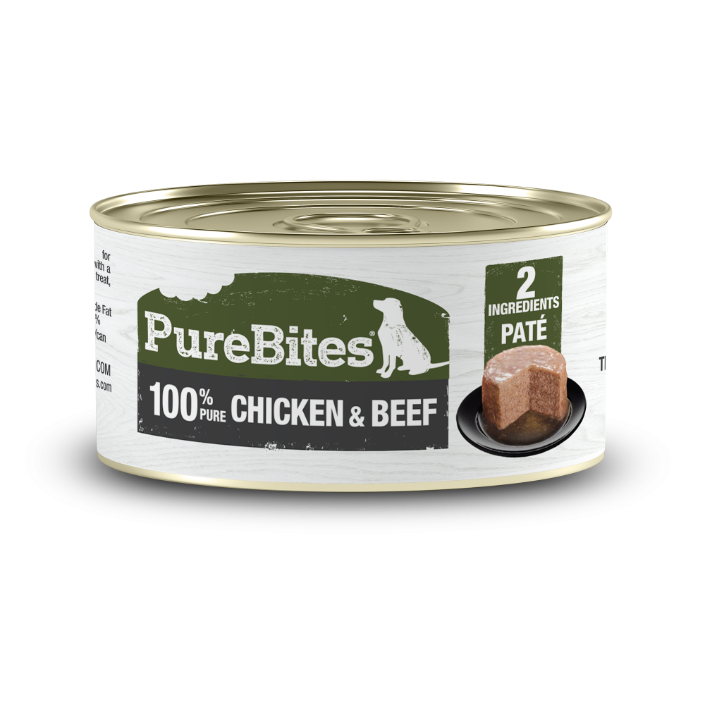 At PureBites, we?re always asking pet parents to ?Go ahead, look at our ingredients?. Simplicity and the high-quality ingredients we choose to feed our family makes a difference. At PureBites this means every member of our family. PureBites 100% Pure Chicken & Beef Paté is the ultimate limited ingredient dog treat, mixer, appetizer, or protein booster. Made with only 2 simple high-quality ingredients: 100% pure chicken & beef. Nothing else. No artificial colors, fillers, sweeteners, or preservatives. Made in a delightfully smooth paté texture that dogs love. PureBites Patés are a great way to make snack time or mealtime fun and exciting, with a taste dogs crave and the nutrients that pet parents love.