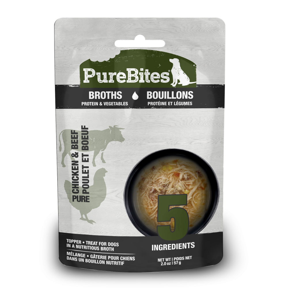 At PureBites, we?re always asking pet parents to ?Go ahead, look at our ingredients?. Simplicity and the high-quality ingredients we choose to feed our family makes a difference. At PureBites, this means every member of our family. PureBites Chicken, Beef & Vegetables Broth is the ultimate limited ingredient treat, topper, or mixer. Made with only 5 simple ingredients: chicken broth, chicken, beef, sweet potato, and tomato. Nothing else. No artificial colors, fillers, sweeteners, or preservatives. PureBites Broths are a great way to make mealtime fun and exciting, with chicken, beef, and vegetables in a rich broth that dogs crave and the added nutrients that pet parents love.