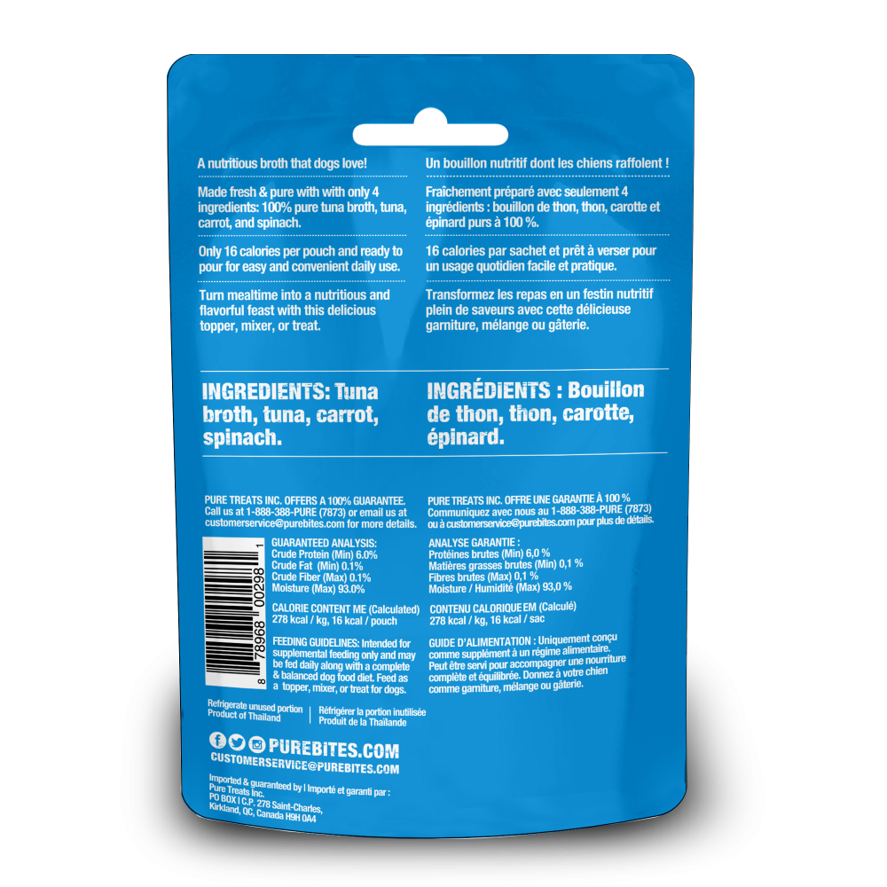 At PureBites, we?re always asking pet parents to ?Go ahead, look at our ingredients?. Simplicity and the high-quality ingredients we choose to feed our family makes a difference. At PureBites, this means every member of our family. PureBites Tuna & Vegetables Broth is the ultimate limited ingredient treat, topper, or mixer. Made with only 4 simple human grade ingredients: tuna broth, wild tuna, carrot, and spinach. Nothing else. No artificial colors, fillers, sweeteners, or preservatives. PureBites Broths are a great way to make mealtime fun and exciting, with tuna and vegetables in a rich broth that dogs crave and the added nutrients that pet parents love.