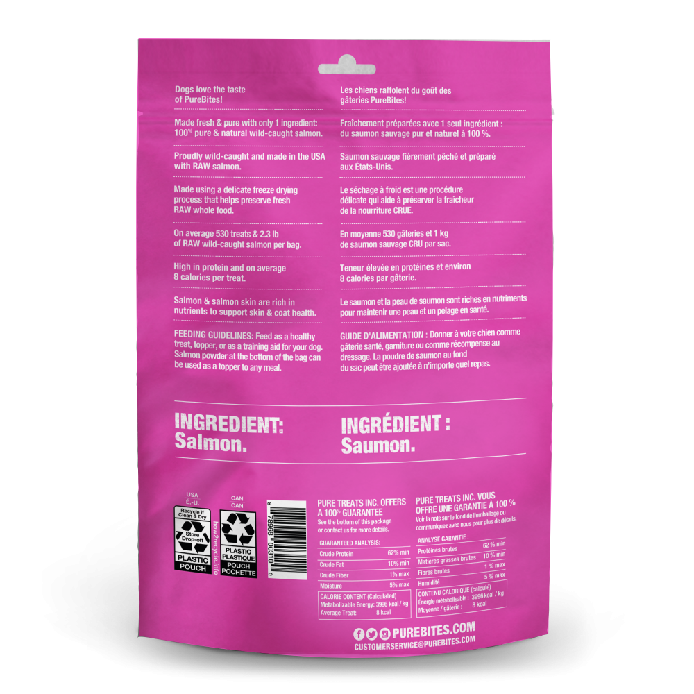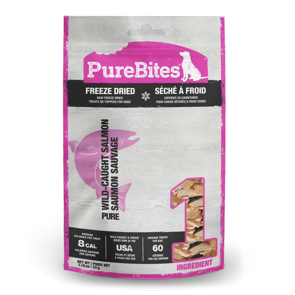 At PureBites, we're always asking pet parents to Go ahead, look at our ingredients. Simplicity and the high-quality ingredients we choose to feed our family makes a difference. At PureBites this means every member of our family. PureBites RAW freeze dried salmon dog treats are the ultimate high-value limited ingredient treat or topper. Made with only 1 simple human grade ingredient you can read, pronounce, and trust: 100% pure wild-caught sockeye salmon. Nothing else. No artificial colors, fillers, or sweeteners. Proudly sourced and made in the USA using a delicate freeze drying process that helps preserve fresh RAW whole food, locking in the taste dogs crave and high protein / low calorie nutrition that pet parents love. Freeze dried treats are a great compliment to a RAW diet since they retain many of the benefits of RAW without the hassle of refrigeration.