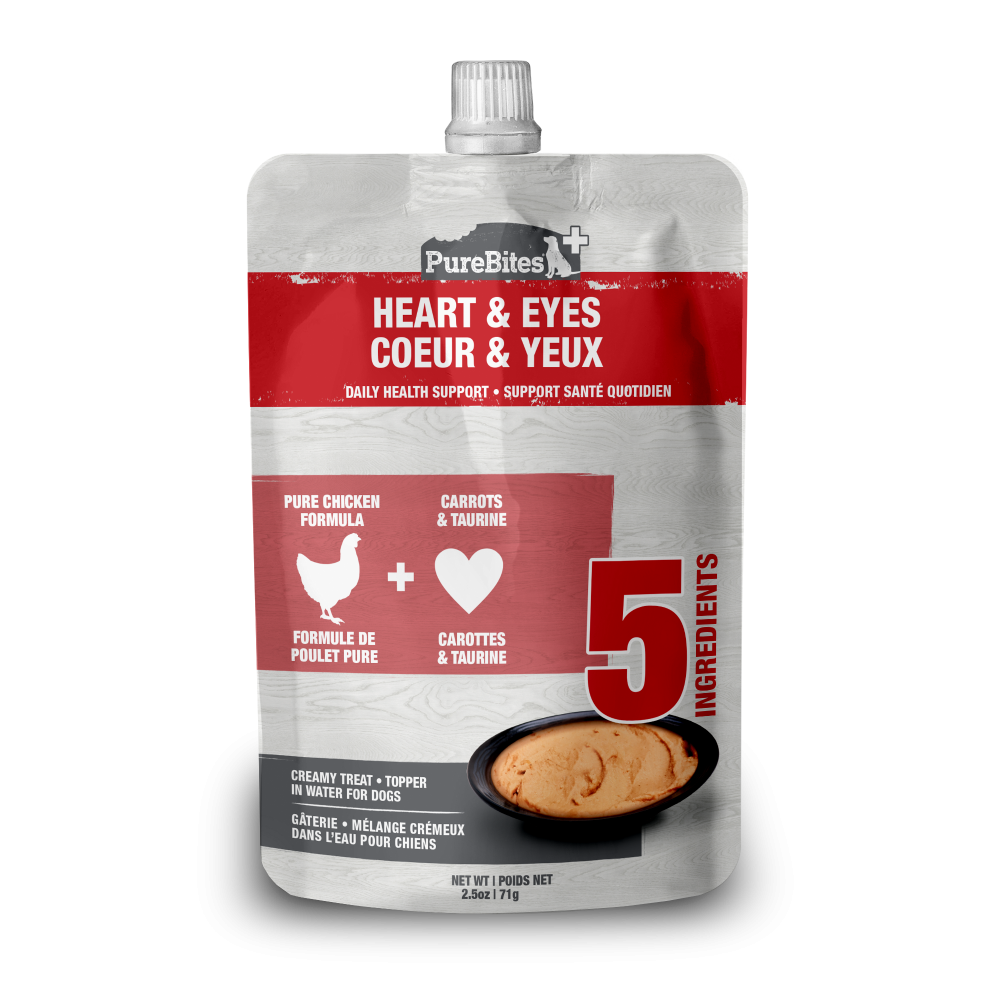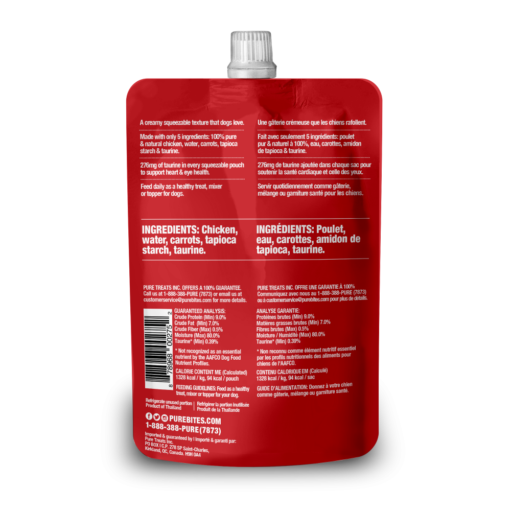 At PureBites, we?re always asking pet parents to ?Go ahead, look at our ingredients?. PureBites+ Squeezables Heart & Eyes formula is made with only 5 simple human grade ingredients you can read, pronounce, and trust: 100% pure chicken, water, carrot, tapioca starch, & taurine. No artificial colors, fillers, or sweeteners. PureBites+ Heart & Eyes formula has 276mg of taurine and carrots added to every squeezable pouch to support daily heart & eye health. We make our treats fresh & pure in a creamy texture and in a fun and interactive squeezable pouch, locking in the taste dogs crave and superior nutrition that pet parents love.