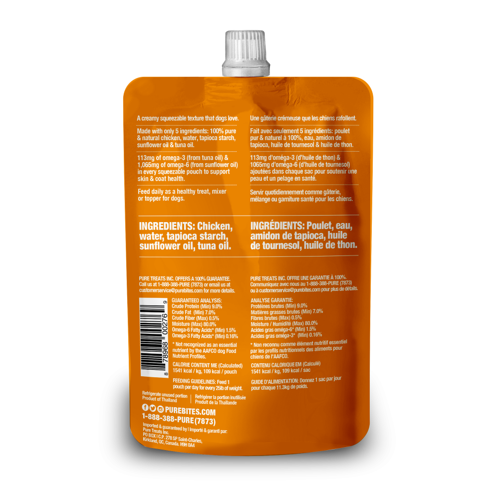 At PureBites, we?re always asking pet parents to ?Go ahead, look at our ingredients?. PureBites+ Squeezables Skin & Coat formula is made with only 5 simple human grade ingredients you can read, pronounce, and trust: 100% pure chicken, water, tapioca starch, sunflower oil, & tuna oil. No artificial colors, fillers, or sweeteners. PureBites+ Skin & Coat formula has 113mg of omega-3 and 1065mg of omega-6 added to every squeezable pouch to support daily skin & coat health. We make our treats fresh & pure in a creamy texture and in a fun and interactive squeezable pouch, locking in the taste dogs crave and superior nutrition that pet parents love.