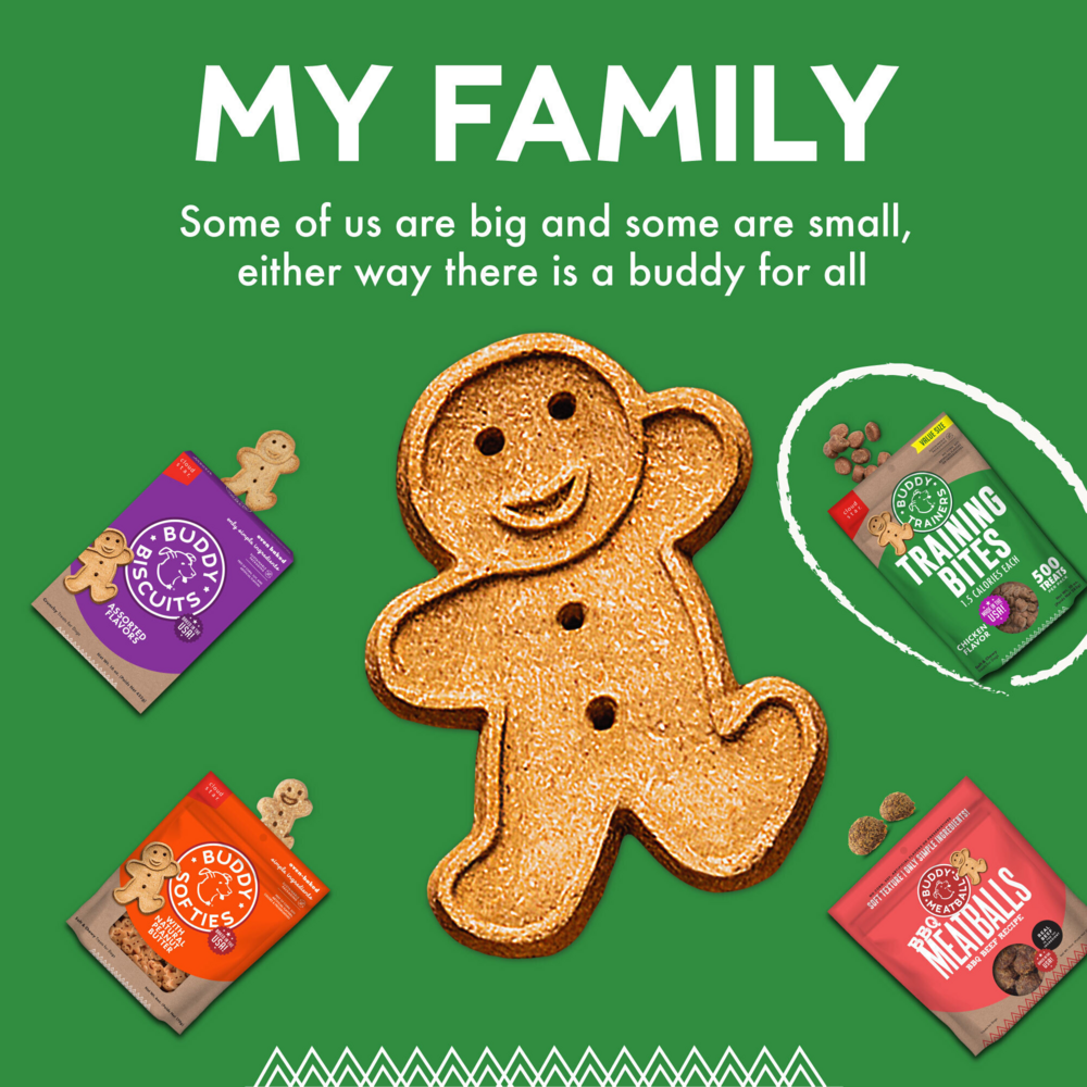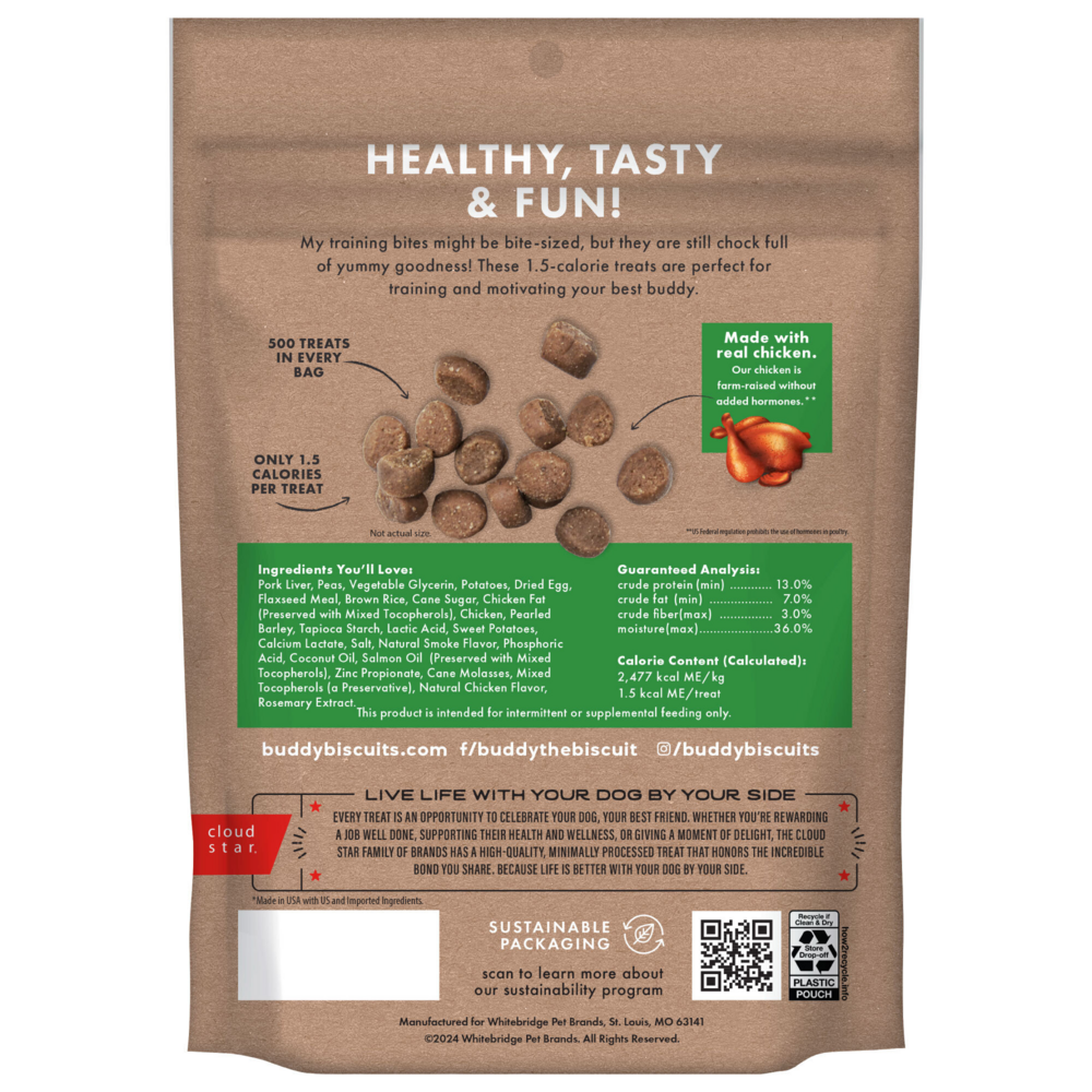 Buddy Trainers Training Bites with natural chicken are the perfect training treat to reward and motivate your dog. There are over 500 treeats in every bag and each piece is highly palatable with a pork liver base and only 1.5 calories. Buddy makes training a breeze