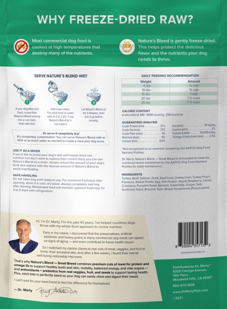 Nature’s Blend, Dr. Marty’s Premium Freeze-Dried Dog Food, is a nutrition-packed formula designed to give your dog a healthier, happier life. We blend a variety of meats, fish, ranch-raised beef and duck, and other protein sources with fruits and vegetables for the balanced, complete nutrition your dog needs. We receive all our ingredients fresh, then gently freeze dry them so they’re bursting with flavor and nutrition.