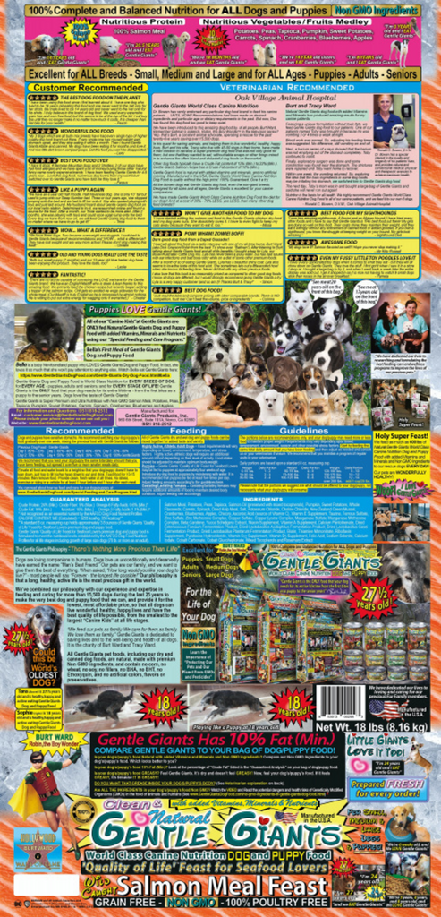 Our life's cause is to help all dogs live the longest, healthiest, happiest lives possible. Gentle Giants Dog and Puppy Food is excellent for all dogs and puppies of all ages, sizes, and stages of life - from 2 pounds to 300 pounds - from the youngest 3 1/2 week old puppies to the oldest seniors that are 27 years old. Read about all of our products and ingredients, and how we intentionally made Gentle Giants Dog and Puppy Food affordable, so that all dogs can benefit.