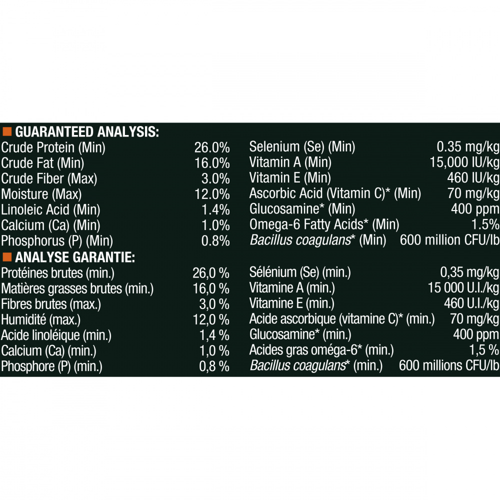 Beef, rice, whole grain wheat, corn gluten meal, poultry by-product meal (source ofglucosamine), soybean meal, whole grain corn, beef fat preserved with mixed-tocopherols, dried eggproduct, dried beet pulp, fish meal (source of glucosamine), natural flavor, glycerin, calcium carbonate,wheat bran, mono and dicalcium phosphate, soybean oil, salt, potassium chloride, VITAMINS [Vitamin Esupplement, niacin (Vitamin B-3), Vitamin A supplement, calcium pantothenate (Vitamin B-5), thiaminemononitrate (Vitamin B-1), Vitamin B-12 supplement, riboflavin supplement (Vitamin B-2), pyridoxinehydrochloride (Vitamin B-6), folic acid (Vitamin B-9), Vitamin D-3 supplement, menadione sodium bisulfitecomplex (Vitamin K), biotin (Vitamin B-7)], MINERALS [zinc proteinate, manganese proteinate, ferroussulfate, copper proteinate, calcium iodate, sodium selenite], choline chloride, L-ascorbyl-2-polyphosphate(Vitamin C), dried Bacillus coagulans fermentation product, garlic oil.