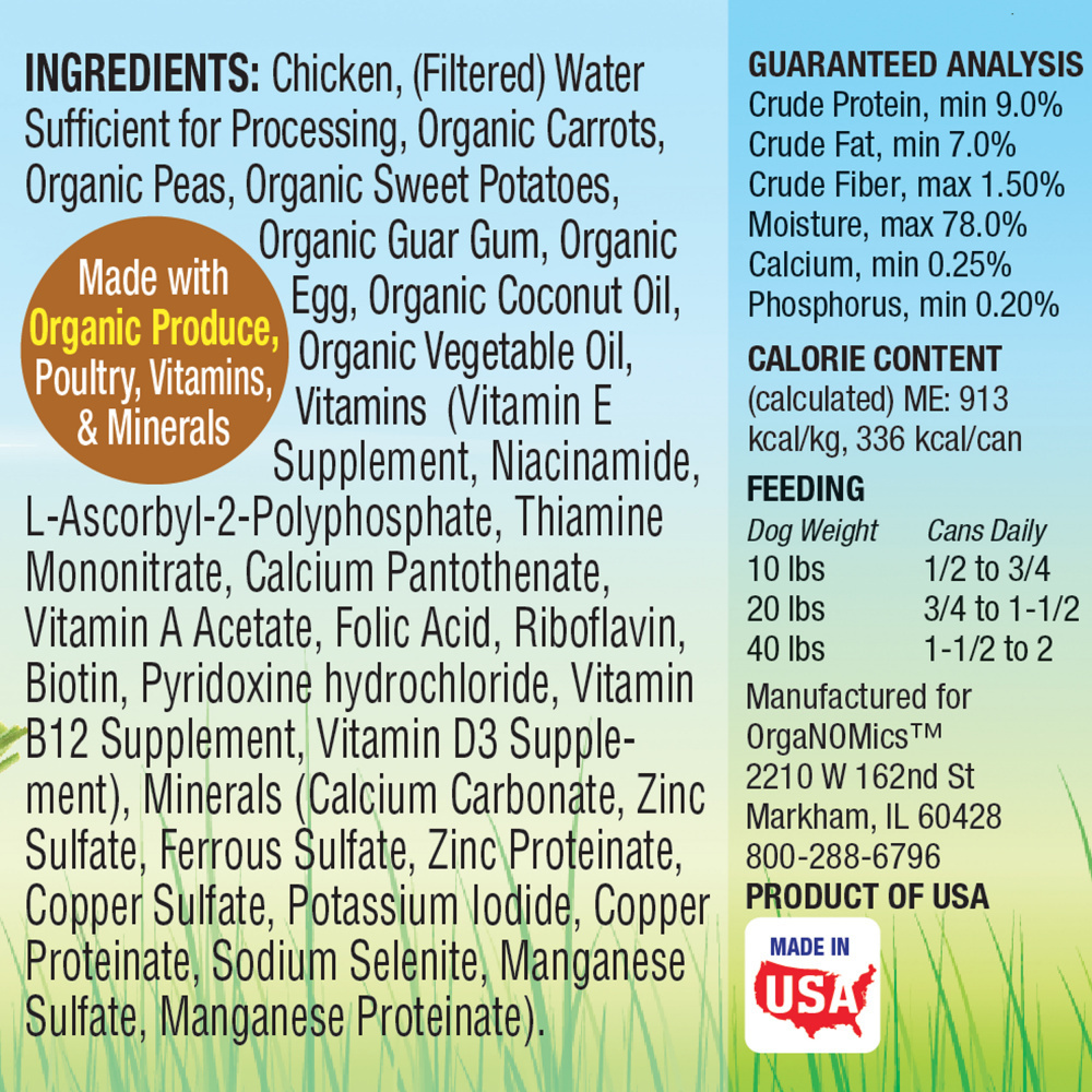 Chicken, Organic Carrots, Organic Peas, Organic Sweet Potatoes, Organic Guar Gum, Organic Egg, Organic Coconut Oil, Organic Vegetable Oil, Vitamins (Vitamin E Supplement, Niacinamide, L-Ascorbyl-2-Polyphosphate, Thiamine Mononitrate, Calcium Pantothenate, Vitamin A Acetate, Folic Acid, Riboflavin, Biotin, Pyridoxine hydrochloride, Vitamin B12 Supplement, Vitamin D3 Supplement), Minerals (Calcium Carbonate, Zinc Sulfate, Ferrous Sulfate, Zinc Proteinate, Copper Sulfate, Potassium Iodide, Copper Proteinate, Manganese Sulfate, Manganese Proteinate).