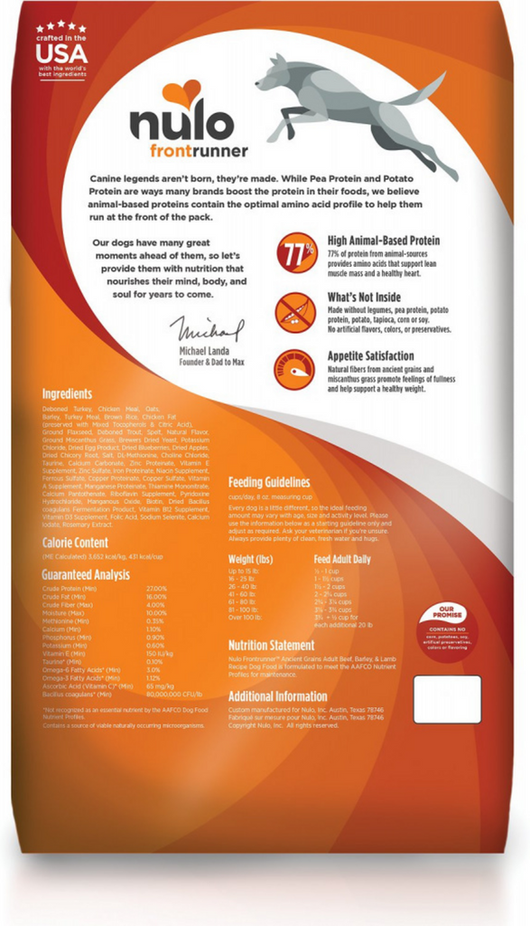 Nulo’s recipes are exactly what animals need. They’re high in animal-based protein, low in carbs and use low-glycemic ingredients to promote healthy body conditions and stable energy. Nulo also adds a patented probiotic to aid with digestion that survives the cooking process, shelf life and is viable in your pet’s digestive tract. All of the ingredients are carefully selected with intention and purpose. They are functional, delicious and nutritious. The standard has been, and always will be, if Michael wouldn’t feed it to Max, Nulo won’t sell it.