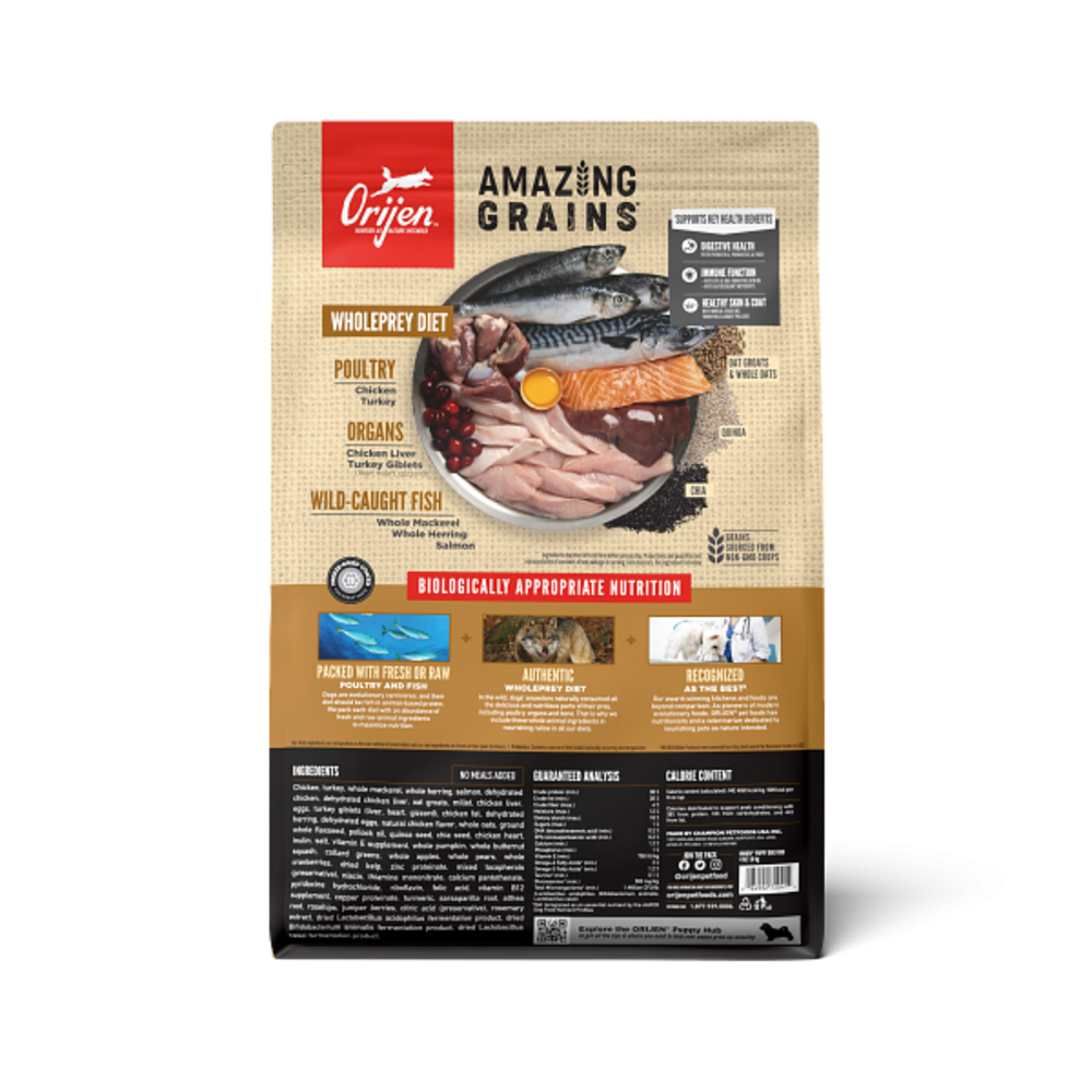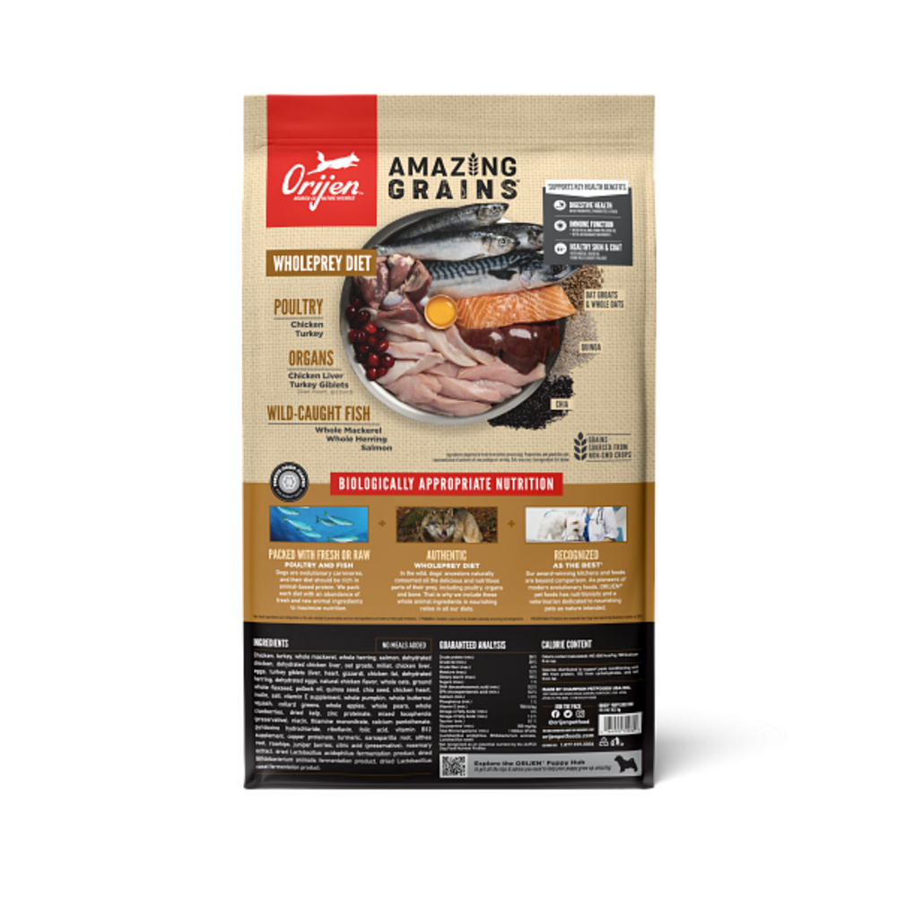 Nourish your puppy’s instincts and help it grow up strong with ORIJEN AMAZING GRAINS Puppy Dry Dog Food. Made with DHA and EPA from pollock oil, this dog food kibble includes antioxidant nutrients to support your puppy's immune health, while Omega 3-rich oil from wild-caught pollock helps your puppy's coat and skin stay shiny and healthy. This ORIJEN dog food for puppies also provides prebiotics, probiotics, fiber from inulin and a high-quality blend of oats, quinoa and chia for a balanced fiber ratio that helps support your puppy’s digestive health. The first five ingredients of this puppy dog food are fresh or raw chicken, turkey, whole herring, whole mackerel and salmon, giving your puppy a source of protein, vitamins and minerals. Made with 90% animal ingredients*, ORIJEN's authentic WholePrey diet features the most succulent and nutrient-rich parts of the prey and a freeze dried coating that provides a burst of flavor dogs instinctively crave. Our included fresh ingredients are delivered refrigerated and our included raw ingredients are delivered frozen. NOURISH AS NATURE INTENDED. *Approximate 90%. Derived from the unprocessed state of ingredients.