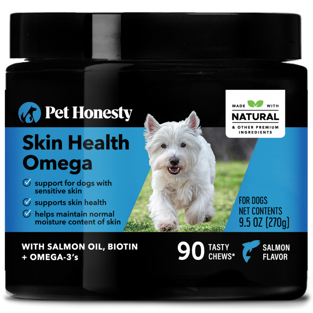 'Pet Honestys Skin Health Omega soft chews are a delicious and easy way to promote your dogs skin and coat health support a healthy immune response and soothe skin related issues associated with seasonal allergies These vet recommended supplements are packed full of omega 3s and antioxidants coming from natural sources like kelp salmon oil and algae which are crucial for skin joint and heart health