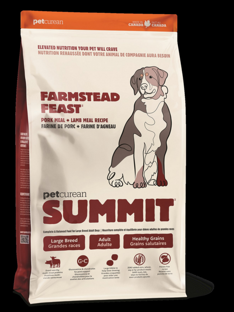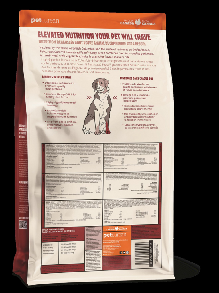 Inspired by the farms of British Columbia, and the sizzle of red meat on the barbecue, Petcurean Summit Farmstead Feast Large Breed combines premium-quality pork meal and lamb meal with vegetables, fruits and grains for flavour in every bite.? Delicious and nutrient-rich premium-quality meat proteins? Balanced Omega 3 and 6 for healthy skin and coat? Highly digestible oatmeal for energy? Antioxidant-rich fruit and veggies to support immune function? Free from added artificial preservatives, flavours and colours