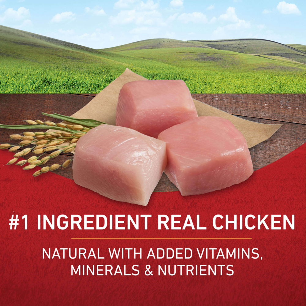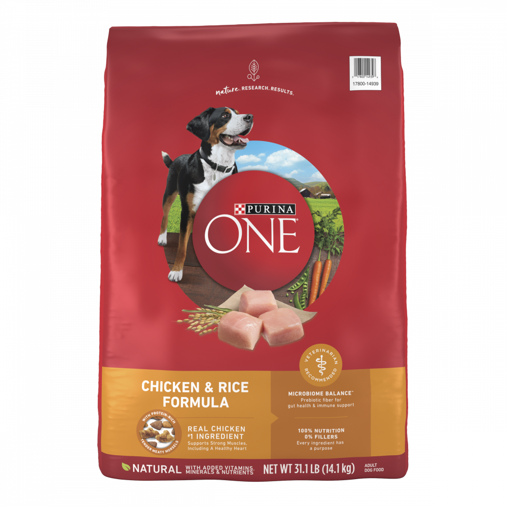 Give your dog a delicious meal inspired by the science of nature when you serve Purina ONE SmartBlend Natural Chicken & Rice Formula adult dry dog food. Real chicken is the #1 ingredient in this recipe, and it's blended with other high-quality protein sources to help support your dog's strong muscles and a healthy heart. The combination of protein-rich, tender, meaty morsels and crunchy kibble delivers a tempting texture your dog can't resist, and a pet food formula made with 0% fillers means that every ingredient in this dry dog food has a purpose. With its highly-digestible formula, this wholesome recipe helps to ensure more nutrition goes to work inside your dog, and natural sources of glucosamine help support healthy joints. Rest easy knowing he's getting 100% complete and balanced nutrition to support his lifelong whole-body health, and watch as he delights in every bite of this Purina ONE SmartBlend recipe.Tempt your dog at mealtime with Purina ONE SmartBlend Natural Chicken & Rice Formula adult dry dog food. Different kibble shapes add enjoyment at mealtime, and real chicken gives him the satisfying taste he craves. Each serving of dog food contains a dual-defense antioxidant blend, including vitamins E & A along with minerals zinc and selenium, to support his strong immune system, and natural sources of glucosamine help support joint health. Omega-6 fatty acids help to support his healthy skin and coat, and the SmartBlend of ingredients helps to deliver complete and balanced nutrition. Serve this dry dog food according to the feeding instructions based on his weight, and make it a delicious part of his daily diet. For even more variety at mealtime, let your faithful friend explore our complete line of Purina ONE SmartBlend wet and dry dog food formulas so he can choose the tastes and textures he loves best. Your dog is a beloved member of your family, and you want him to feel like family by giving him wholesome, nutritious meals he can enjoy. That's why we formulate this dry dog food with high-quality ingredients. We proudly produce this recipe in our Purina-owned U.S. facilities, so you know exactly where his meals are coming from. Our team of experts performs rigorous checks for quality and safety throughout the production process to give you added peace of mind every time you fill his dish with our food for dogs. At Purina, we have over 90 years of experience pushing pet nutrition forward, and we are continually exploring possibilities in nutrition and working to turn those possibilities into positive differences in your dog's life. Offer up Purina ONE SmartBlend Chicken & Rice Formula adult dry dog food as the main course at mealtime, and show your dog how much you value his health and happiness.
