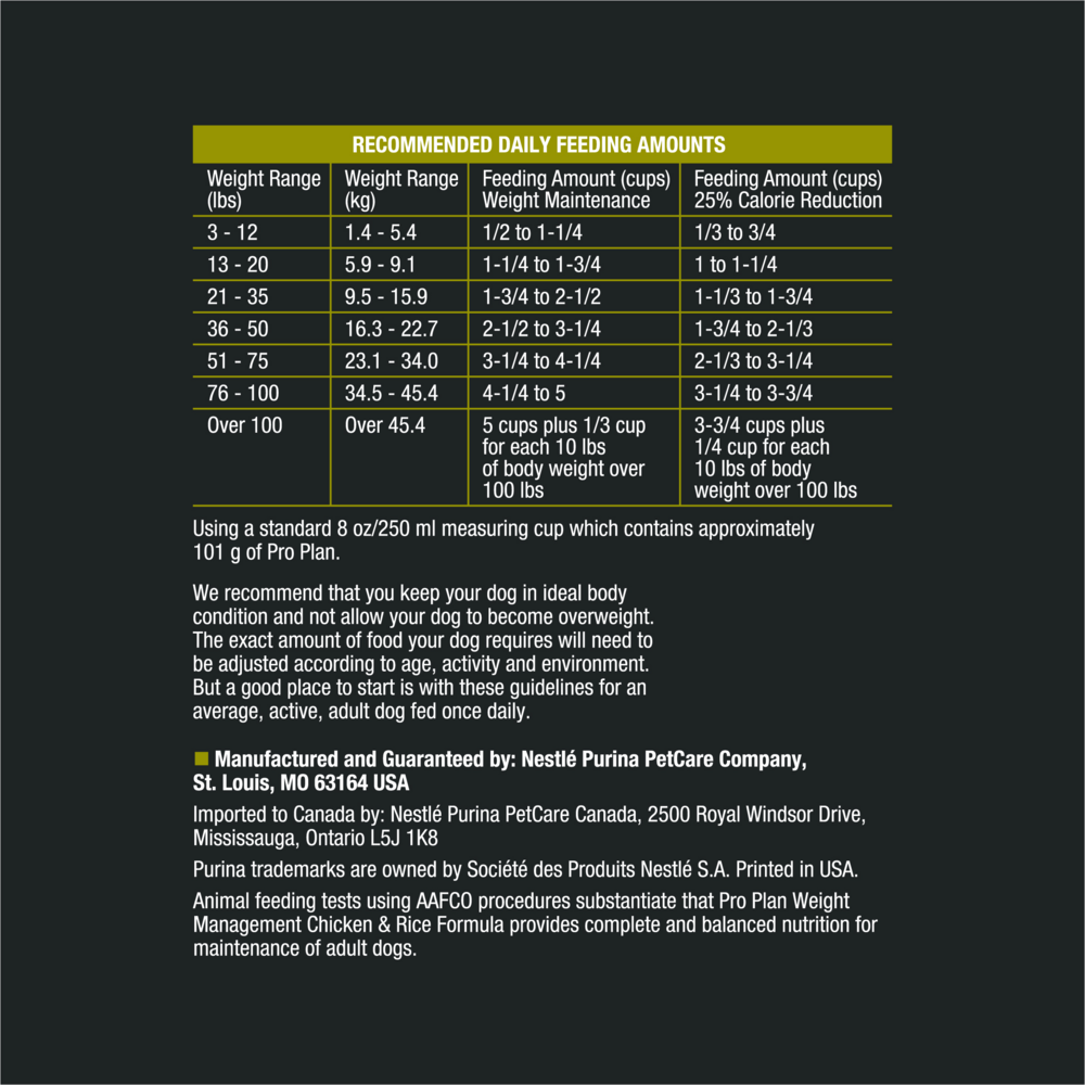 | Give your dog the specialized nutrition he needs with Purina Pro Plan Weight Management Chicken and Rice Formula dry dog food. Each serving contains 15 percent less fat than Pro Plan Complete Essentials Chicken and Rice Formula adult dog food, offering a convenient way to help maintain your dog's healthy weight. Chicken is the first ingredient in this dog kibble, providing high protein to help him maintain lean muscle mass during weight loss. Also included are live probiotics for dogs for gut microbiome resilience and Omega-6 fatty acids and vitamin A to nourish skin and coat. Each high-quality ingredient in this healthy-weight dog food is carefully chosen for a specific nutritional or functional purpose to offer your dog a wholesome meal. Formulated to provide 100 percent complete and balanced nutrition for overweight or less active adult dogs, this dry dog food helps to support your dog's overall health and wellness. |