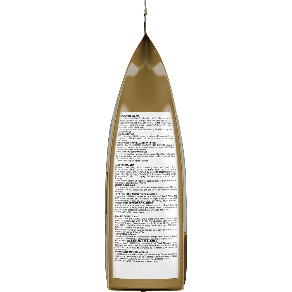 Royal Canin knows what makes your Cavalier King Charles Spaniel magnificent is in the details. With their expressive eyes and feathered, wavy coat, Cavaliers are intelligent lapdogs fit for a king. These sweet family companions can benefit from the right diet to promote their cardiac health, maintain an ideal weight, and provide precise nutrients for a gorgeous, healthy coat. Royal Canin Cavalier King Charles Spaniel Adult dry dog food is tailor-made nutrition created just for your purebred Cavalier. Whether you have a Tricolor, Black & Tan, Ruby, or Blenheim Spaniel, this exclusive breed-specific diet is uniquely formulated for your Cavalier King Charles Spaniel, with the specific nutrients to help them thrive. The custom kibble is designed for your Cavie’s tapered muzzle and scissor bite, making it easy for them to pick up and chew. An appropriate calorie content promotes a healthy weight, while targeted nutrients help maintain your Cavalier's cardiac function. And vitamin A, as well as EPA and DHA from fish oil, helps nourish healthy skin and coat.With nearly 50 years of scientific research and observation, Royal Canin continues to deliver targeted nutrition to feed every pet’s magnificence. Not satisfied? Then neither are we. Our breed health formulas are 100% satisfaction guaranteed. (Just contact us for more details.Royal Canin Cavalier King Charles Spaniel Adult dry dog food is designed to meet the nutritional needs of purebred Cavaliers 10 months and olderExclusive kibble shape helps Cavalier King Charles Spaniels easily pick up and chew their foodPromotes heart health with taurine, EPA and DHA from fish oil, and L-carnitine for healthy cardiac functionHelps maintain an ideal weight with a balanced formulaSupports coat health with EPA and DHA from fish oil to help keep a Cavalier’s coat silky and beautiful