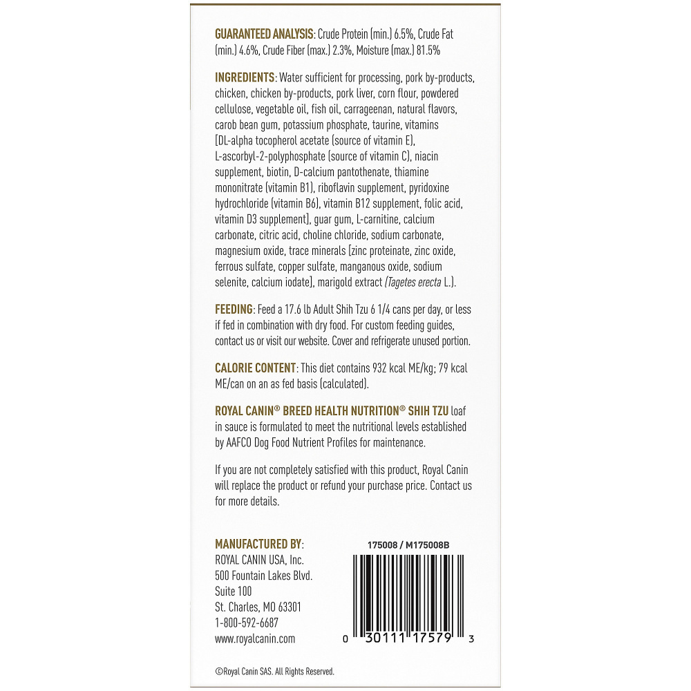 Royal Canin knows what makes your Shih Tzu magnificent is in the details. Also known as a Chrysanthemum dog, Shih Tzus are big-eyed, fluffy show dogs ready to win anyone over. These pampered pooches can benefit from precise nutrition from a food that’s easy to eat, that helps promote a healthy skin and coat, and that helps support cardiac health. Royal Canin Shih Tzu Loaf in Sauce wet dog food is tailor-made nutrition created just for your pure breed Shih Tzu. This exclusive breed-specific diet is uniquely formulated for your Shih Tzu with specific nutrients to help them thrive. The complete and balanced soft dog food features a smooth paté texture that’s easy for your Shih Tzu to eat. EPA and DHA from fish oil promote healthy skin and optimal coat beauty. And to support your Shih Tzu’s cardiac health, nutrients like sodium, taurine, and L-carnitine help keep their hearts healthy and strong. Mix in or complement with Royal Canin Shih Tzu Adult dry dog food for a meal that’s sure to please your lovable lap dog. With nearly 50 years of scientific research and observation, Royal Canin continues to deliver targeted nutrition to feed every pet’s magnificence. Not satisfied? Then neither are we. Our breed health formulas are 100% satisfaction guaranteed. (Just contact us for more details.Royal Canin Shih Tzu Adult wet dog food is designed to meet the nutritional needs of purebred Shih Tzus 10 months and olderSoft dog food featuring Loaf in Sauce for a paté that appeals to a Shih Tzu’s appetite and is easy for them to eatSupports skin health with an exclusive complex of nutrients including EPA, DHA, and vitamin APromotes heart health with targeted levels of sodium, taurine, and L-carnitine for healthy cardiac functionComplete and balanced canned dog food can be fed alone or mixed with Royal Canin Shih Tzu Adult dry dog food