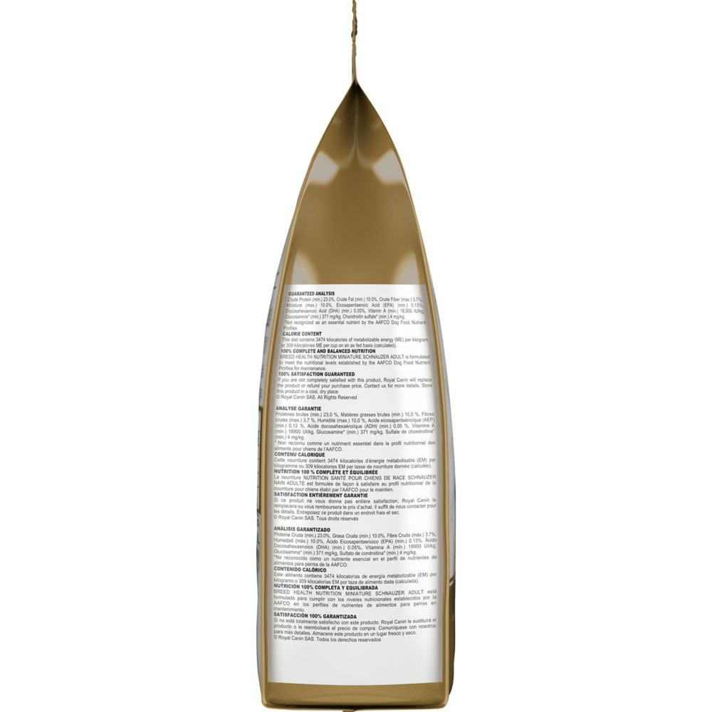 Royal Canin knows what makes your Miniature Schnauzer magnificent is in the details. With their distinguished mustache, Mini Schnauzers are beloved family dogs ready to please and protect their owners. They can benefit from the right diet that promotes skin health and keeps their vibrant coats looking their best. Maintaining a healthy weight is also important for these small breed dogs.Royal Canin Miniature Schnauzer Adult dry dog food is tailor-made nutrition created just for your purebred Schnauzer. This exclusive breed-specific diet is uniquely formulated for your Miniature Schnauzer, with the specific nutrients to help them thrive. The custom kibble is specially designed for your Miniature Schnauzer’s moderately blunt muzzle and scissor bite, making it easy for them to pick up and chew. Vitamin A and EPA and DHA fatty acids help protect skin while specific amino acids give their intense coat color. And to help keep your Mini Schnauzer slim and trim, this balanced formula provides weight management to keep them at an ideal weight. With nearly 50 years of scientific research and observation, Royal Canin continues to deliver targeted nutrition to feed every pet’s magnificence. Not satisfied? Then neither are we. Our breed health formulas are 100% satisfaction guaranteed. (Just contact us for more details.Royal Canin Miniature Schnauzer Adult dry dog food is designed to meet the nutritional needs of purebred Miniature Schnauzers 10 months and olderExclusive small-shaped kibble helps Miniature Schnauzers pick up and chew their foodReinforces the skin barrier with essential nutrients to help protect a Miniature Schnauzer’s sensitive skinSupports a Miniature Schnauzer’s vibrant coat with tailored levels of amino acids to help maintain its signature intense coat colorPromotes weight control with appropriate balanced formula to help maintain an ideal weight