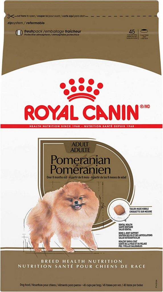 Royal Canin knows what makes Pomeranians special: They’re playful, smart, and full of energy. And even though they’re small in size, they have big personalities. That’s why Royal Canin created breed-specific dog food that’s made especially for purebred Poms.Royal Canin Pomeranian dry food gives your adult Pomeranian the tailored nutrition he needs. This food is enriched with EPA and DHA to help support healthy bones and joint health, and to help promote healthy skin and a shiny coat. It delivers a balanced blend of fibers and highly digestible protein to help support healthy digestion and promote optimal stool quality. Plus, the smaller kibble shape is the perfect size for a small breed dog’s petite jaws. Add some variety to their bowl with Royal Canin Pomeranian wet dog food, designed specifically for your pure breed Pomeranian. With over 50 years of scientific research and observation, Royal Canin continues to deliver targeted nutrition to feed every Pomeranian’s magnificence. Not satisfied? Then neither are we. Our breed health formulas are 100% satisfaction guaranteed. Royal Canin Pomeranian Adult dry dog food is designed to meet the nutritional needs of pure breed adult PomeraniansFeatures an exclusive formula enriched with EPA and DHA to support and maintain skin health and a nourished, beautiful healthy coatSupports this small breed dog’s fragile knees, joints, and overall bone healthDelivers a balanced blend of digestible fibers and highly digestible protein to promote digestive health and optimal stool qualityProvides a smaller kibble shape and size to support the Pomeranian’s smaller jaw while helping to reduce tartar formation, by encouraging the dog to chew