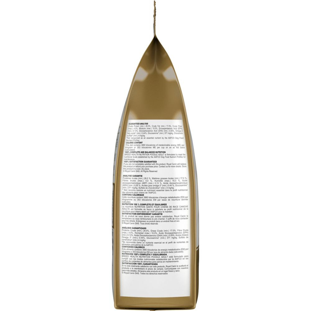 Royal Canin knows what makes your Poodle magnificent is in the details. With both brains and beauty, Poodles are highly alert and active companions with distinctive curly coats. They can benefit from the right diet to maintain skin and coat health and muscle tone, and precise nutrients for healthy aging so they can live long, happy lives. Royal Canin Poodle Adult dry dog food is tailor-made nutrition created just for your purebred Poodle. Whether you have a Miniature Poodle or Toy Poodle, this exclusive breed-specific diet is uniquely formulated for your Poodle, with the specific nutrients to help them thrive. The custom kibble is designed for your Poodle’s straight muzzle and jaw, making it easy for them to pick up and chew. EPA and DHA from fish oil help keep woolly coats super soft. Precise protein content provides nutrition to support healthy muscle tone. And an exclusive blend of antioxidants supports healthy aging as your beloved Poodle reaches maturity. Mix in or complement with Royal Canin Poodle wet dog food for a meal that’s sure to please your Poodle. And once your Poodle is over 8 years old, transition them to Royal Canin Poodle Adult 8+ dog food for precise nutrition into the golden years. With nearly 50 years of scientific research and observation, Royal Canin continues to deliver targeted nutrition to feed every pet’s magnificence. Not satisfied? Then neither are we. Our breed health formulas are 100% satisfaction guaranteed. (Just contact us for more details.Royal Canin Poodle Adult dry dog food is designed to meet the nutritional needs of purebred Poodles 10 months and olderExclusive kibble design helps Poodles easily pick up and chew their foodHelps maintain a Poodle’s coat health with EPA and DHA fatty acids from fish oil and precise protein levels to support continuously growing hairSupports a Poodle’s strong build with precise protein content to maintain muscle toneAn exclusive blend of nutrients supports vitality and healthy aging during their long life span