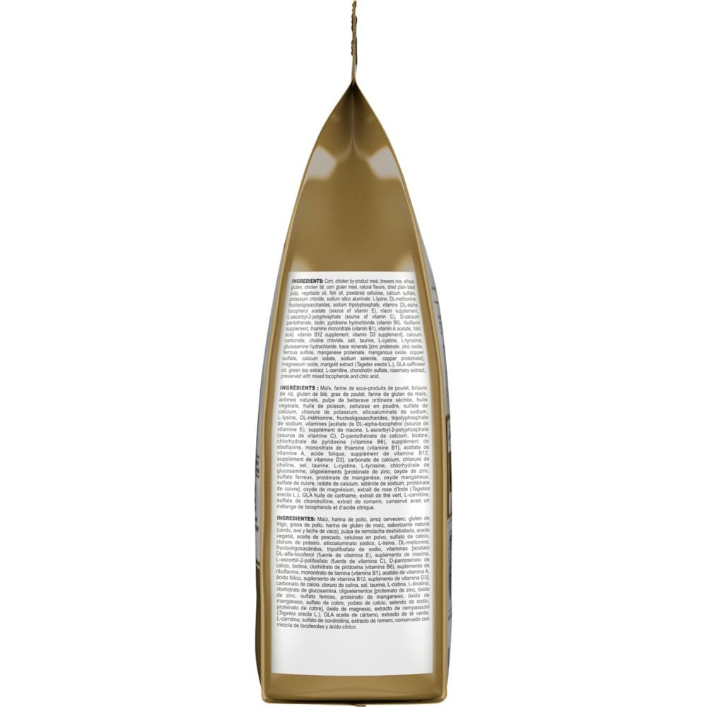 Corn, chicken by-product meal, brewers rice, wheat gluten, chicken fat, corn gluten meal, natural flavors, dried plain beet pulp, vegetable oil, fish oil, powdered cellulose, calcium sulfate, potassium chloride, sodium silico aluminate, L-lysine, DL-methionine, fructooligosaccharides, sodium tripolyphosphate, vitamins [DL-alpha tocopherol acetate (source of vitamin E), niacin supplement, L-ascorbyl-2-polyphosphate (source of vitamin C), D-calcium pantothenate, biotin, pyridoxine hydrochloride (vitamin B6), riboflavin supplement, thiamine mononitrate (vitamin B1), vitamin A acetate, folic acid, vitamin B12 supplement, vitamin D3 supplement], calcium carbonate, choline chloride, salt, taurine, L-cystine, L-tyrosine, glucosamine hydrochloride, trace minerals [zinc proteinate, zinc oxide, ferrous sulfate, manganese proteinate, manganous oxide, copper sulfate, calcium iodate, sodium selenite, copper proteinate], magnesium oxide, marigold extract (Tagetes erecta L.), GLA safflower oil, green tea extract, L-carnitine, chondroitin sulfate, rosemary extract, preserved with mixed tocopherols and citric acid.