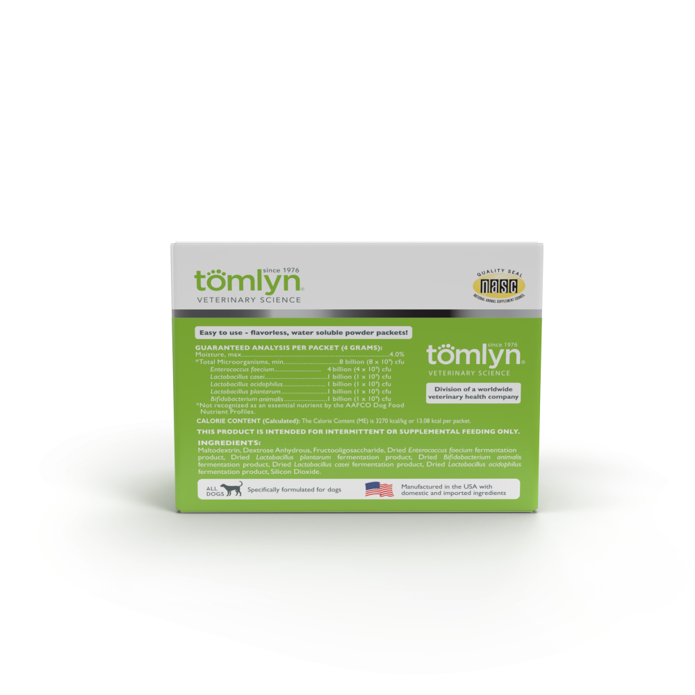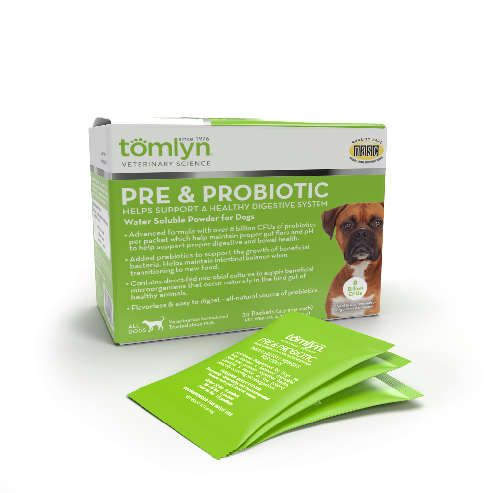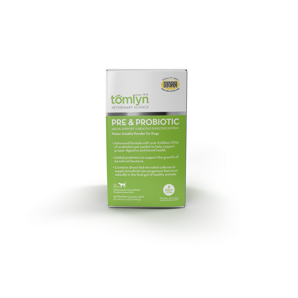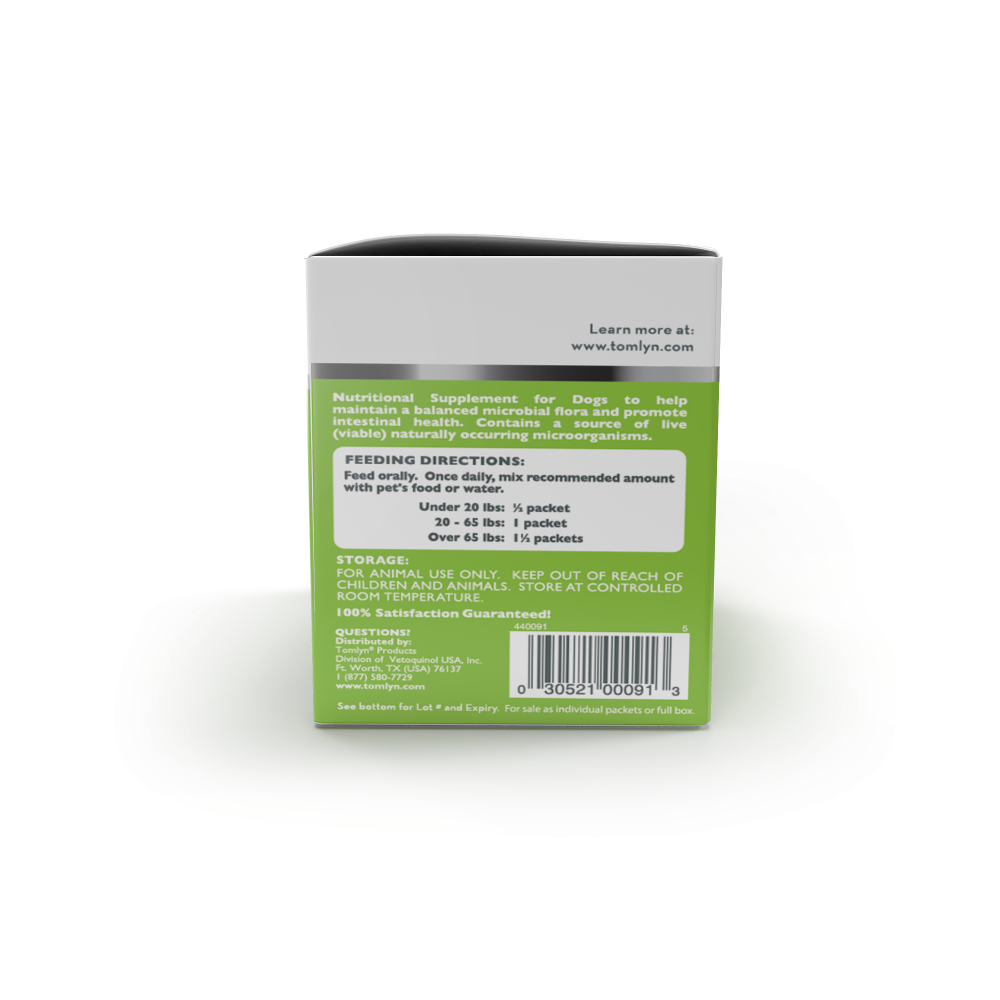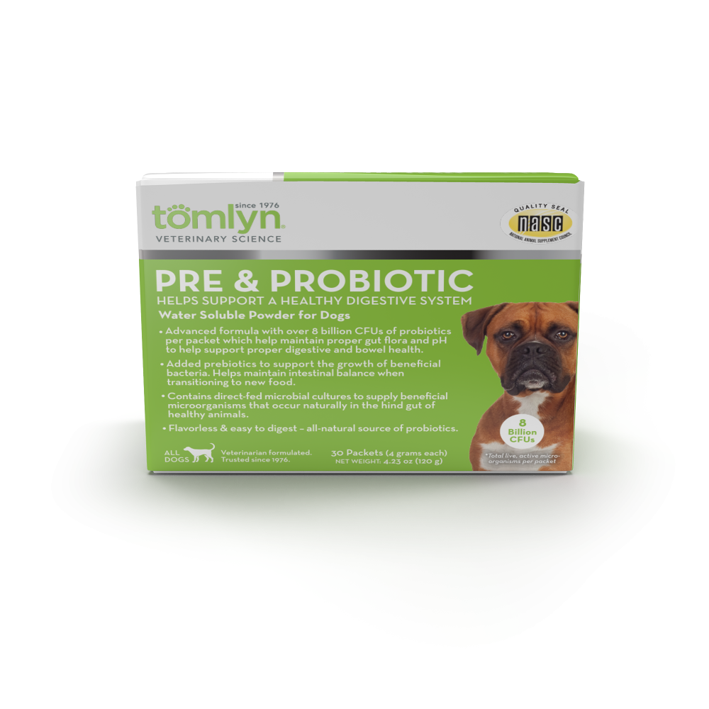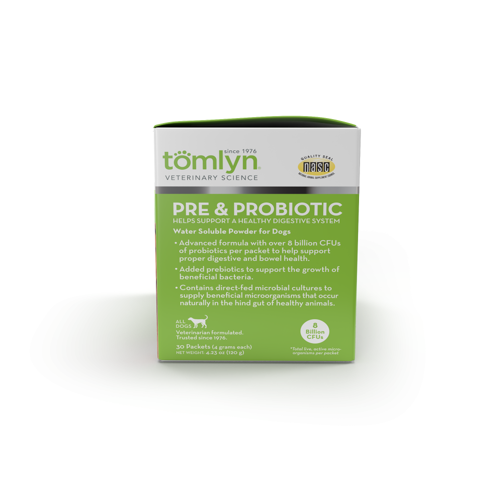 Tomlyn?s Pre & Probiotic Supplement for Dogs helps support balanced microbial flora and promotes intestinal health. Contains a source of live (viable) naturally occurring microorganisms. Advanced formula with over 8 billion CFUs of probiotics per packet to help support proper digestive and bowel health. Added prebiotics to support the growth of beneficial bacteria. Contains direct-fed microbial cultures to supply beneficial microorganisms that occur naturally in the hind gut of healthy animals. This water soluble, flavorless & easy to digest is a natural source of probiotics. Each box contains 30 packets for convenient daily use.